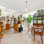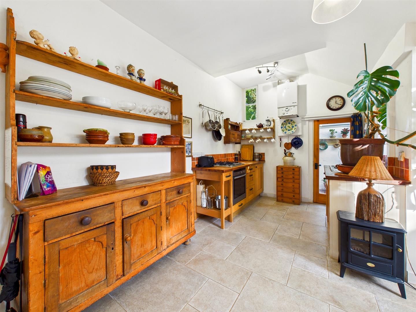 Fitted with a range of wooden fronted units comprising single sink with mixer taps set into work surfaces and tiled upstands, extending to two wall sections. Single Neff oven with four ring gas hob. Wall mounted gas central heating boiler. Tiled flooring and radiator. Single window to rear. Open access into the Dining Room.