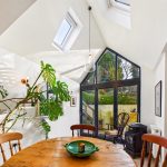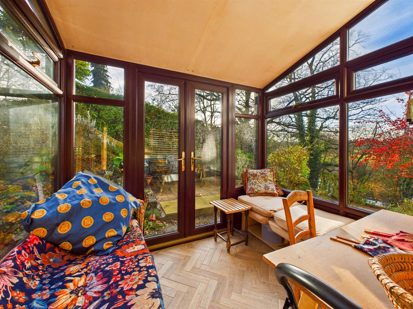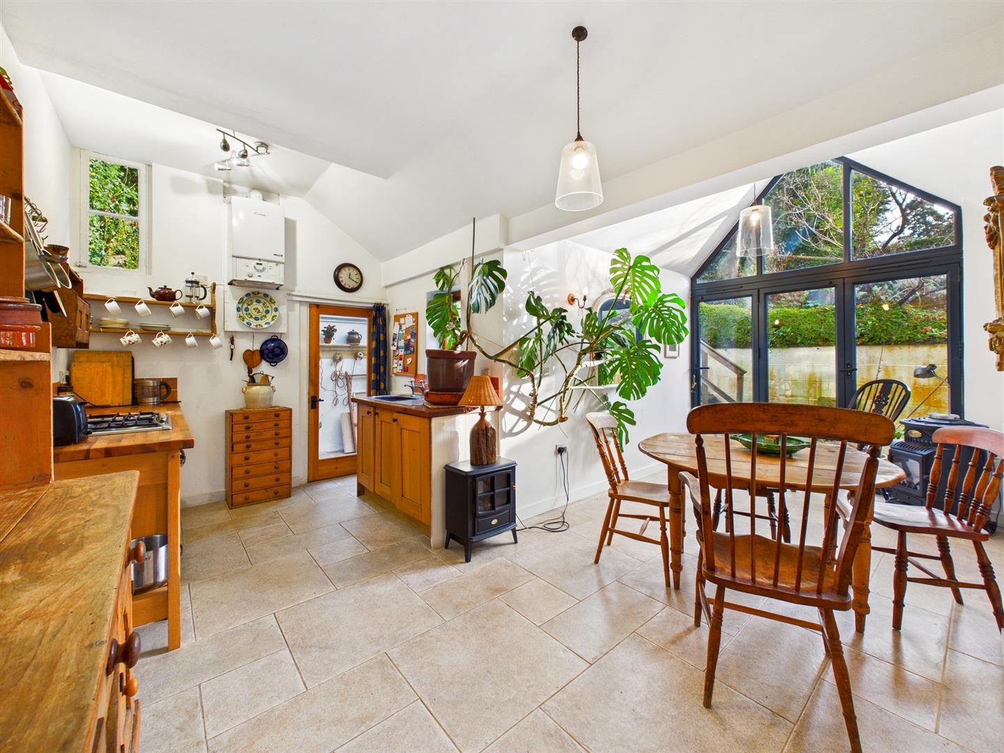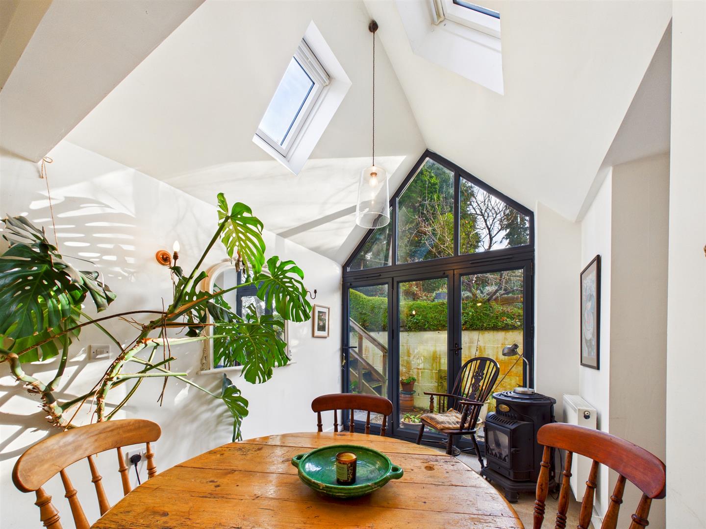 With a continuation of tiled flooring, radiator, vaulted ceiling with two skylight windows. Bi fold doors with windows above leading onto garden. Open access into the Family Room.