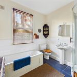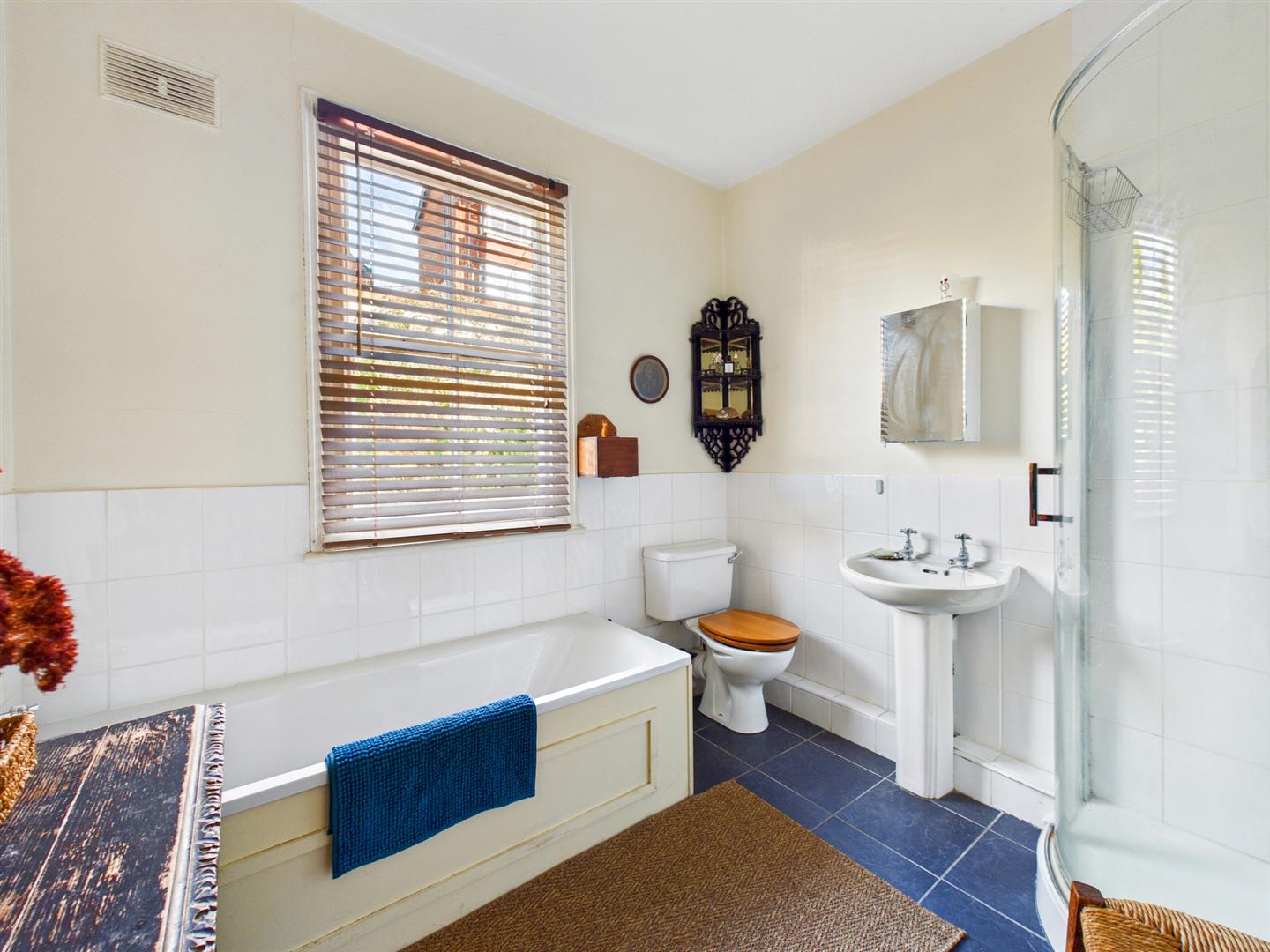 Refitted with a four piece suite comprising of bath, separate corner shower unit with with glass screen and door, wash hand basin and low flush wc. Partly tiled surround to walls, single glazed window to rear and heated towel rail.