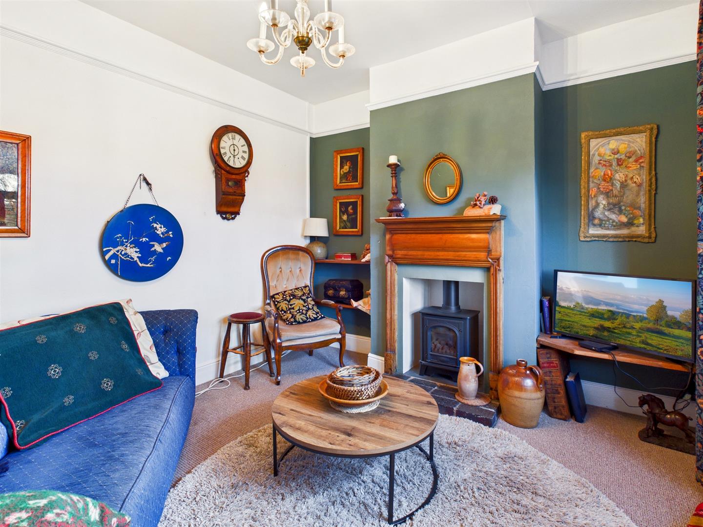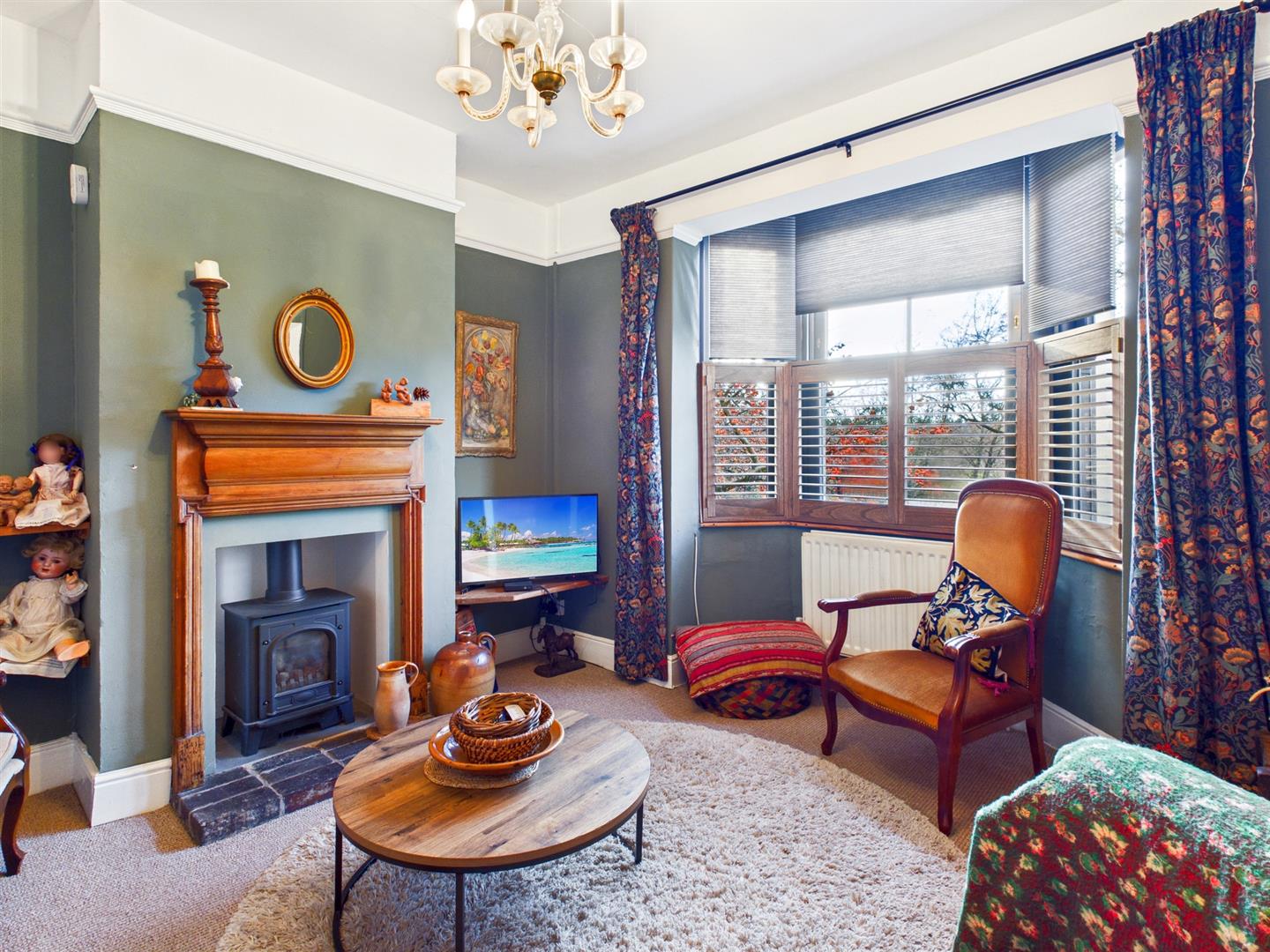 Having walk-in bay with three UPvc double glazed sash windows to front, radiator, wooden decorative fire surround housing log burner set onto a brick hearth.