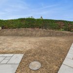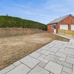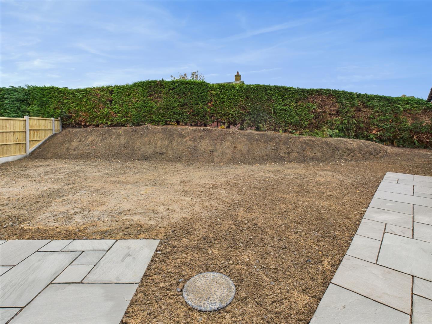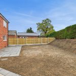 The rear garden will be graded and seeded as lawn with a small paved patio to the rear of the house. The front garden features lawn and borders. A classic picket-style fence defines the property boundary.