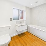 Karndean heavy duty “Oak Effect” vinyl floor. Suite comprising low level W.C., vanity wash hand basin and panel bath with shower over.