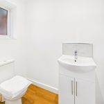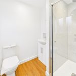 Karndean heavy duty “Oak Effect” vinyl floor. Suite comprising low level W.C., vanity wash hand basin and shower cubicle with double shower heads and thermostatic controls.