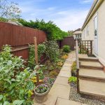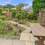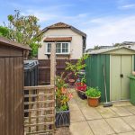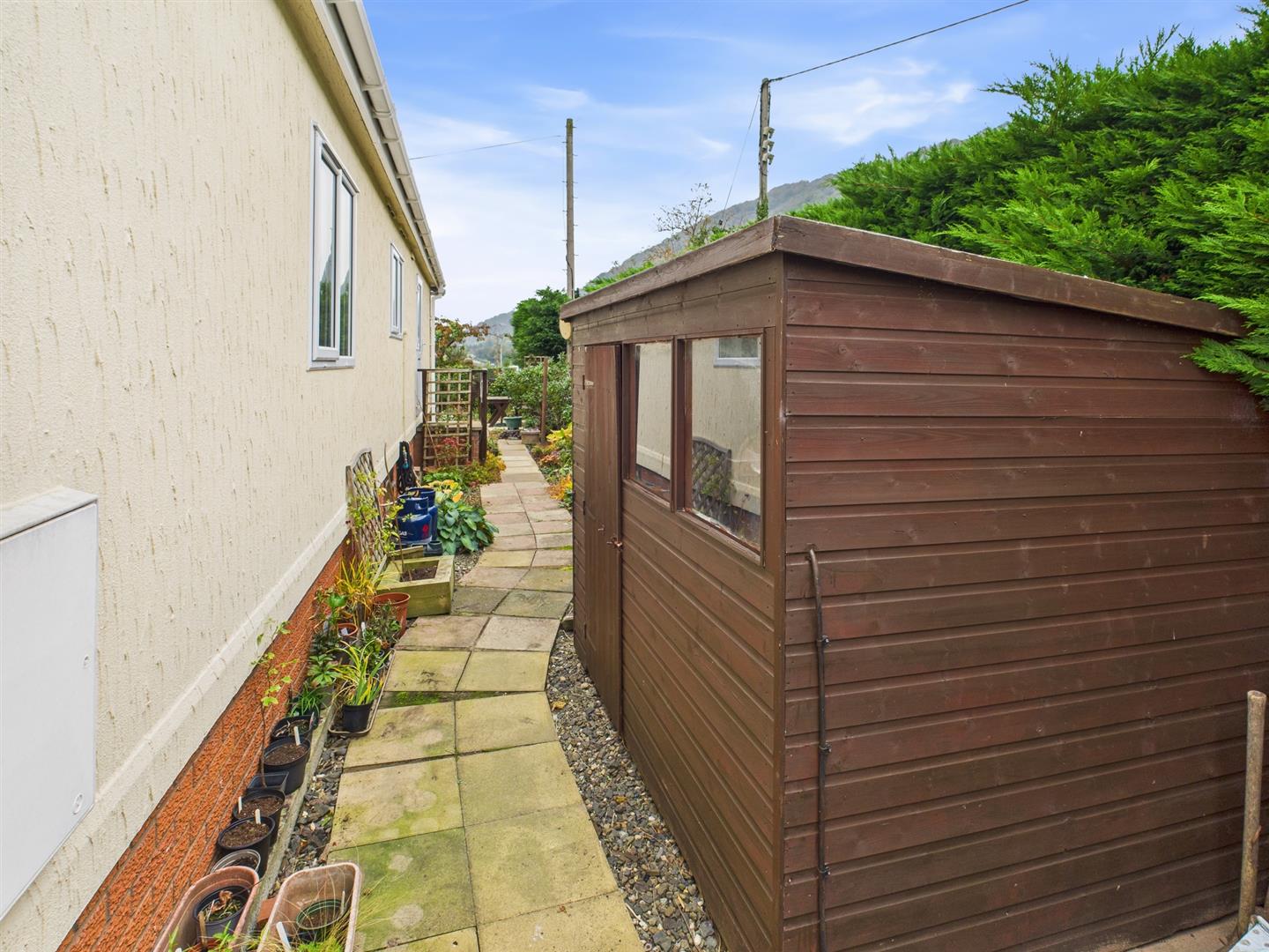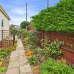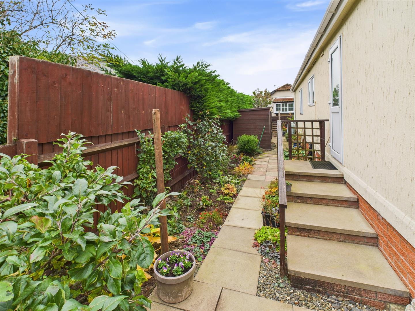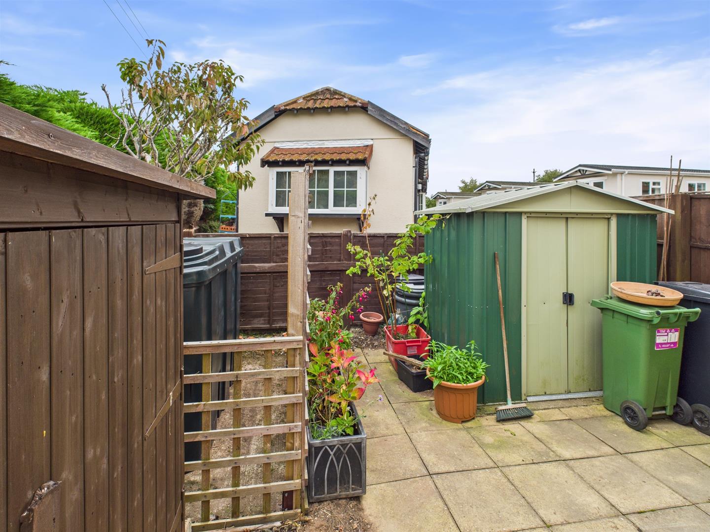 REAR Path leading along the rear of the property, flower and shrubs, steps up to the rear door, outside tap, 2 wooden sheds and a paved area to the side with a metal shed and oil tank (replaced October 2025) Gate leading to the driveway.