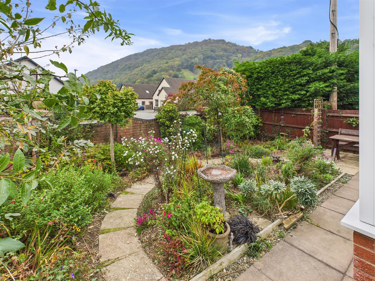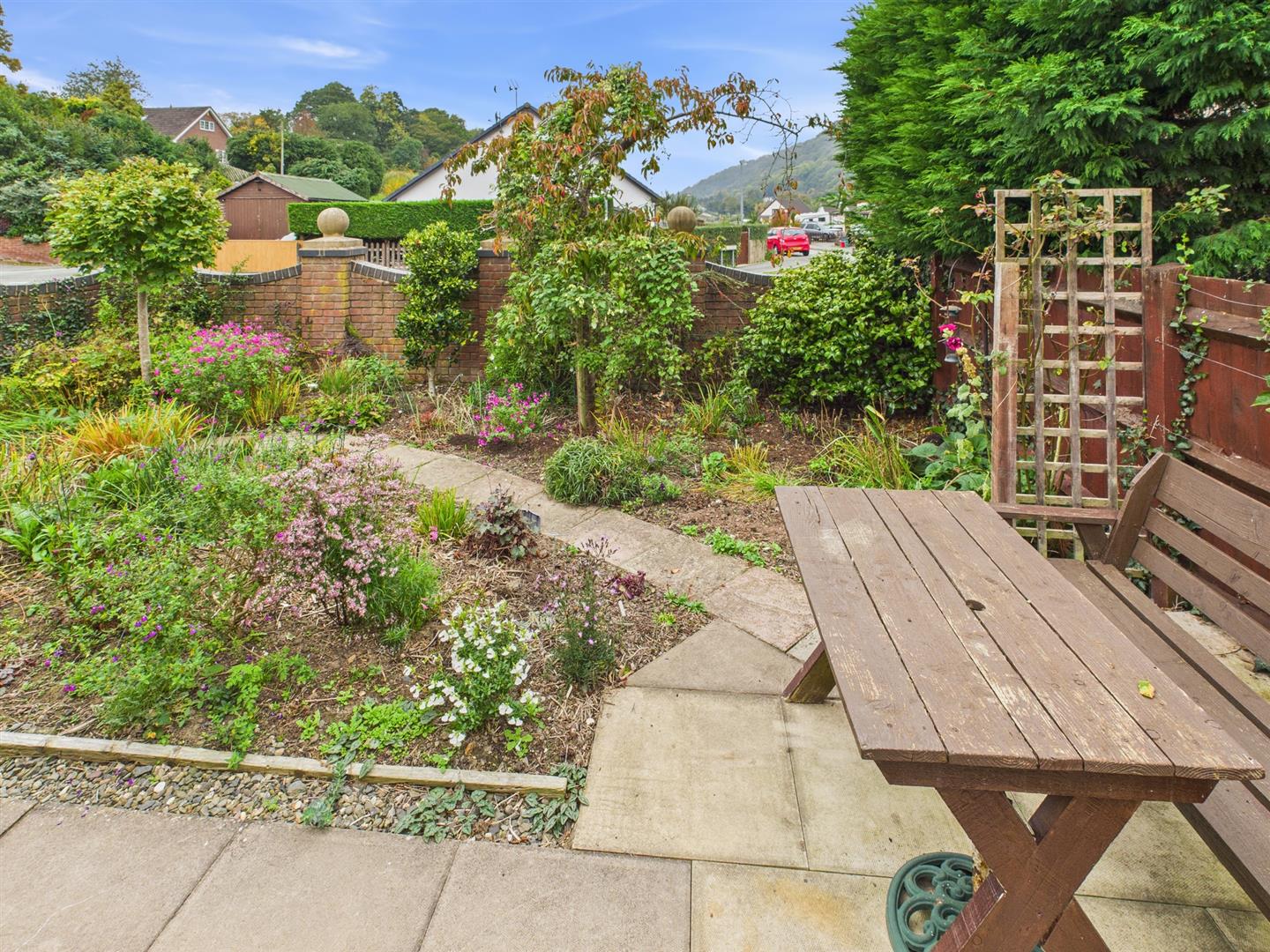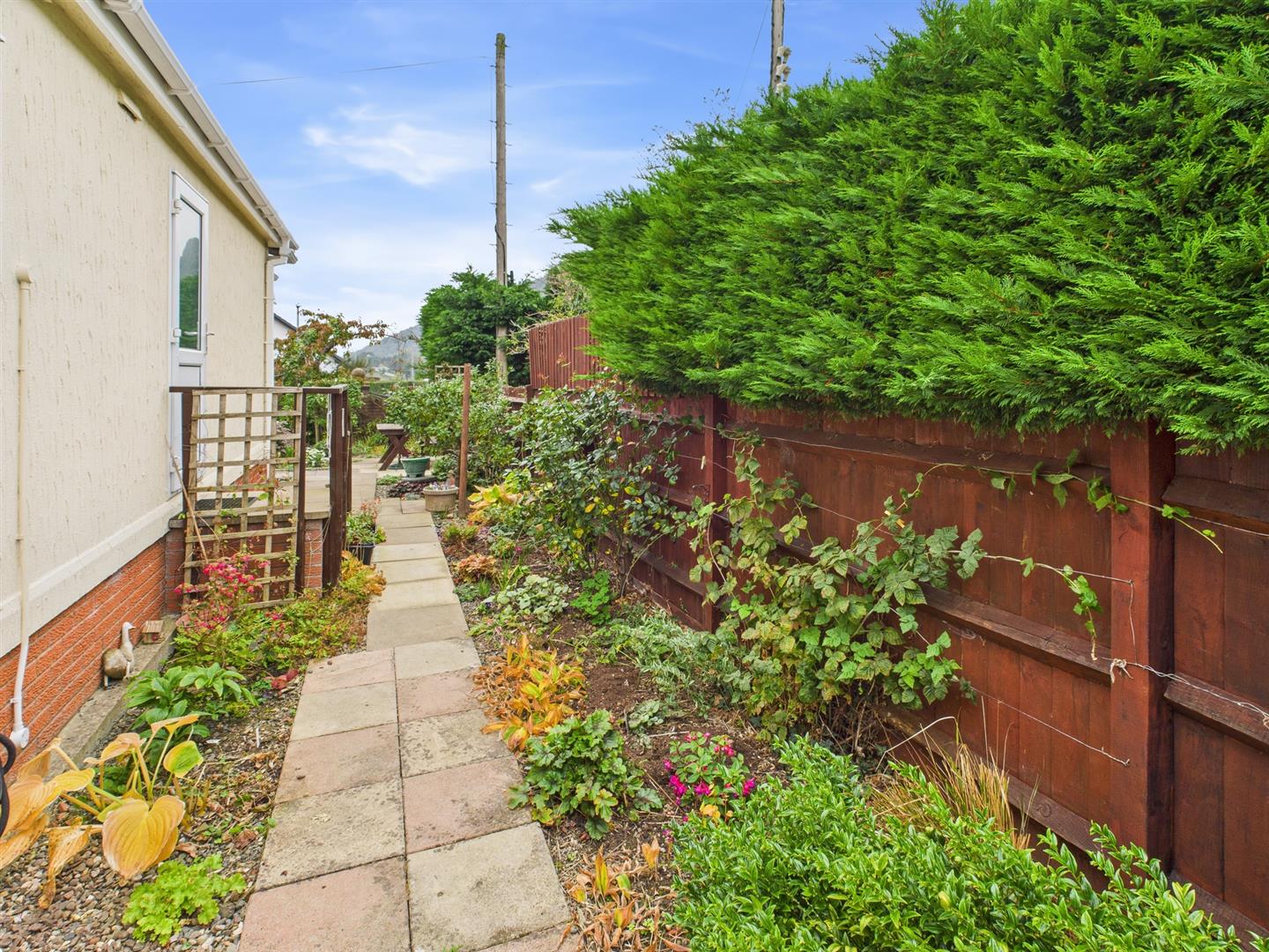 SIDE Well stocked with flowers and shrubs and enjoying views towards countryside, patio entertainment area, 3 fruit tress.