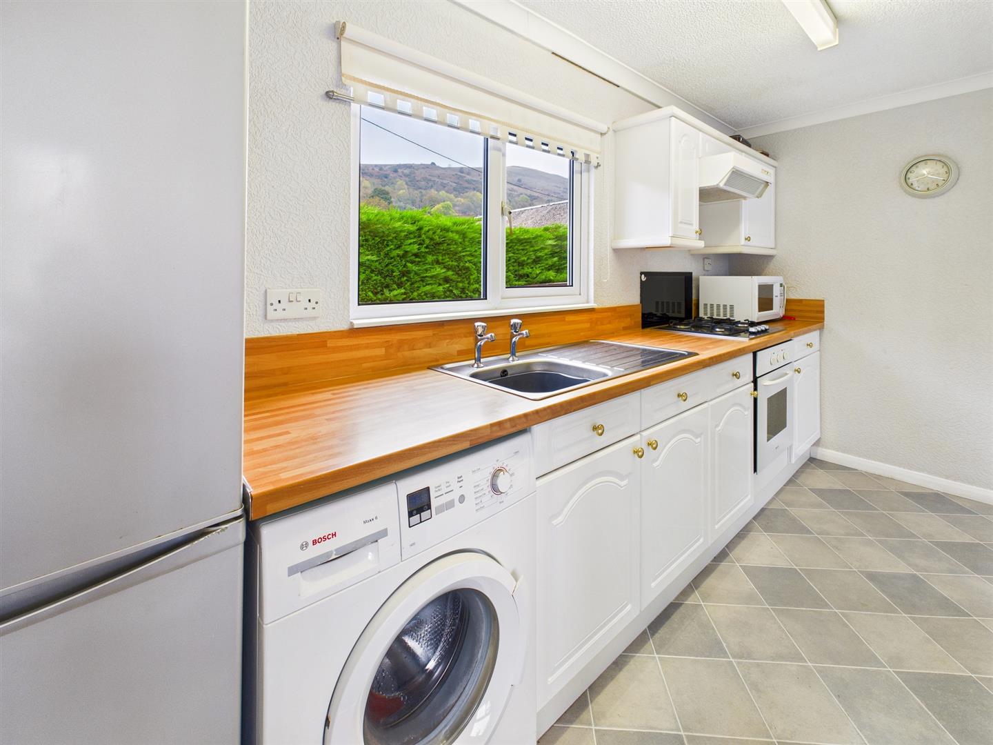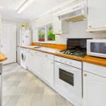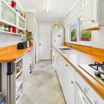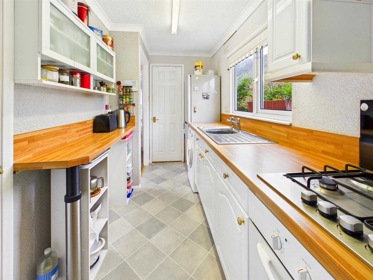 Fitted with a range of base cupboards and drawers with wood effect work surfaces over, eye level cupboards and shelving, breakfast bar, built in oven and 4 ring gas hob with splash back and extractor hood over, stainless steel sink under a uPVC double glazed window to the rear, built in larder cupboard with shelving, boiler cupboard with shelving, plumbing and space for washing machine, space for tall fridge freezer, coved ceiling and radiator. Door to: