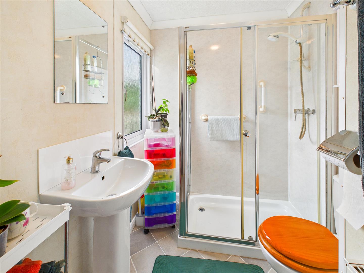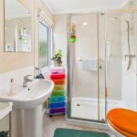 Low level W.C., pedestal wash hand basin with mixer tap and tiled splashback, walk in shower cubicle, radiator and uPVC double glazed window.