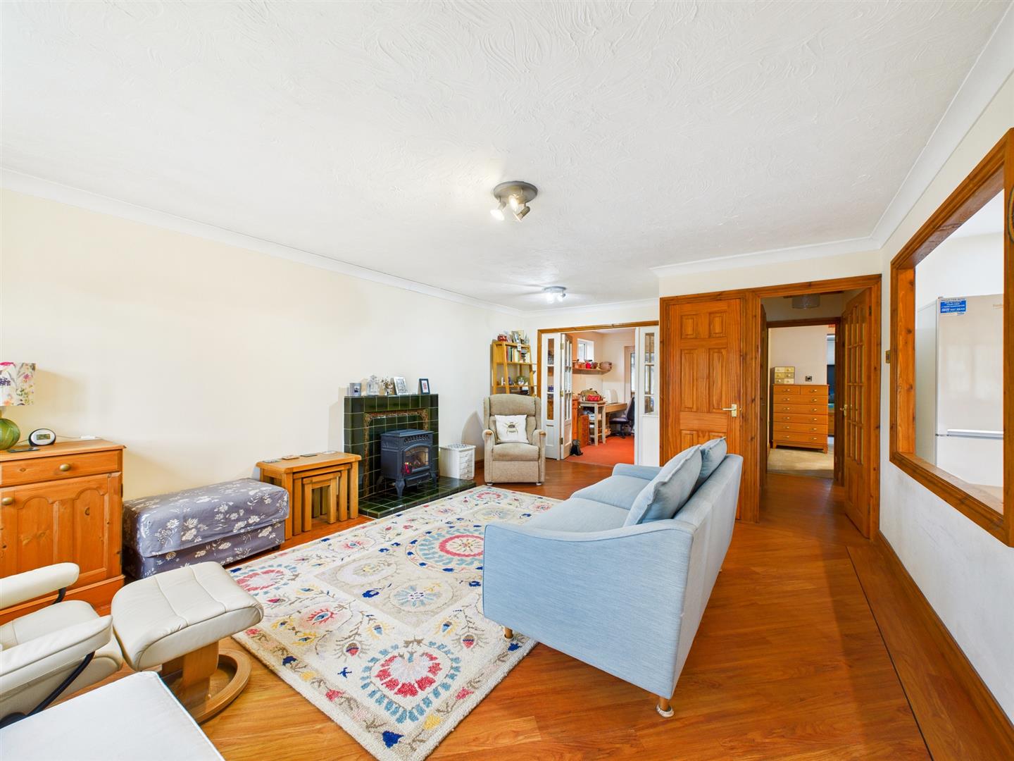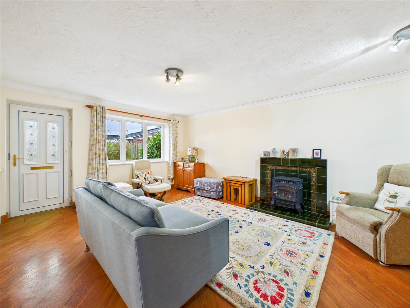 With uPVC window to the front, wood effect flooring, feature tiles fire place, ceiling light and radiator. Built in storage cupboard, door into the hall, dining room and kitchen.