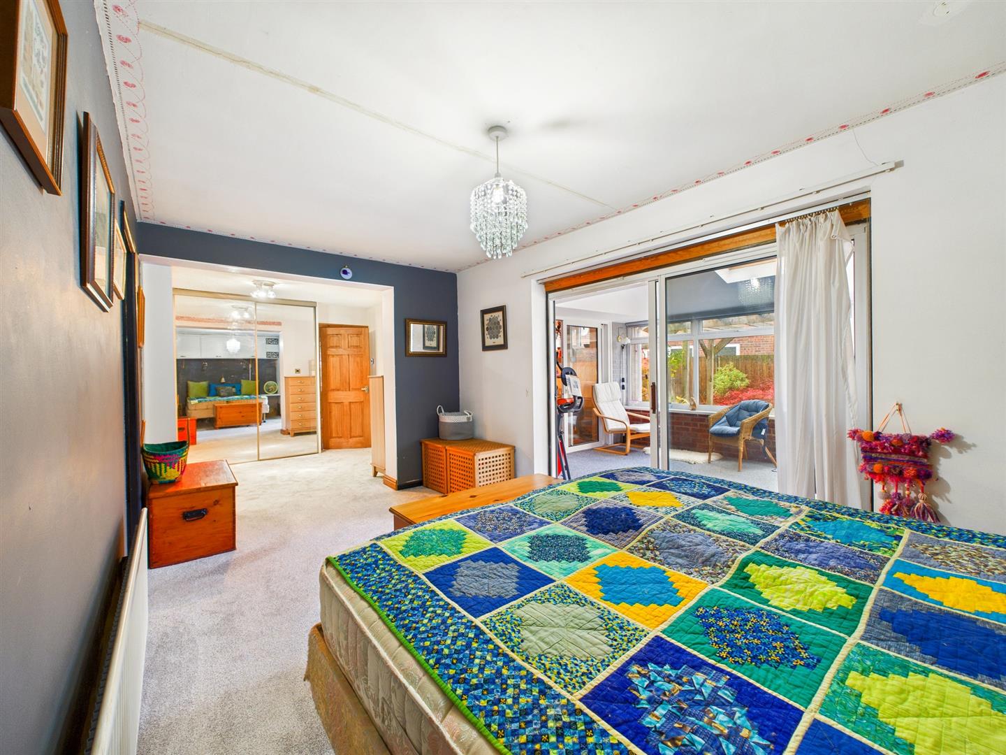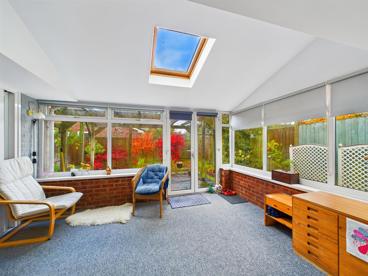 With uPVC windows surround overlooking the rear garden, double doors opening onto the patio, sliding doors into bedroom one, Velux window and ceiling light.