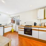 Fitted with a range of wall and base units with work surfaces over, inset sink with mixer tap and drainer and integral oven with gas ring hob over. Part tiled walls, wood effect flooring, uPVC window to the front and side and uPVC door to the side. Spot lighting, wall mounted boiler and void for appliances.