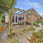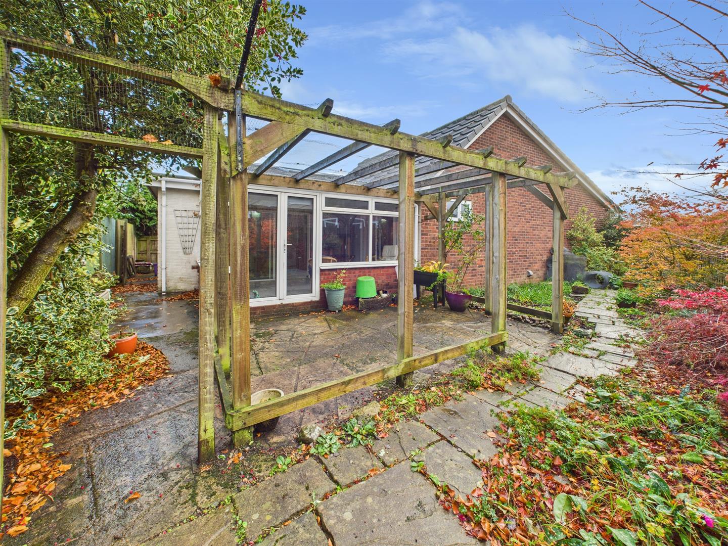 The rear garden is mainly slabbed for ease of access and maintenance with pergola and flower beds to the side.