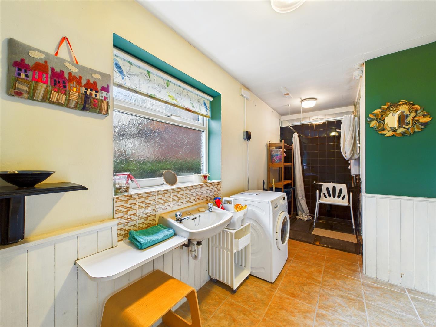 Shower area with tiled splash back, WC and wash hand basin. Part panelled walls, uPVC window to the side, tiled flooring and ceiling light.