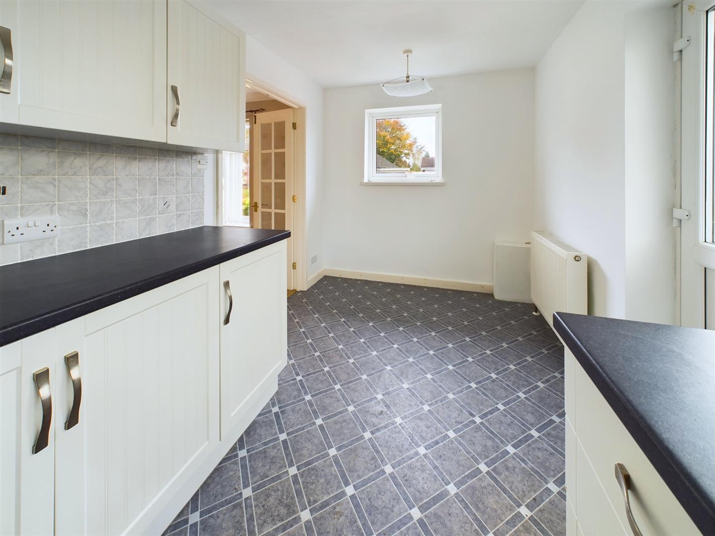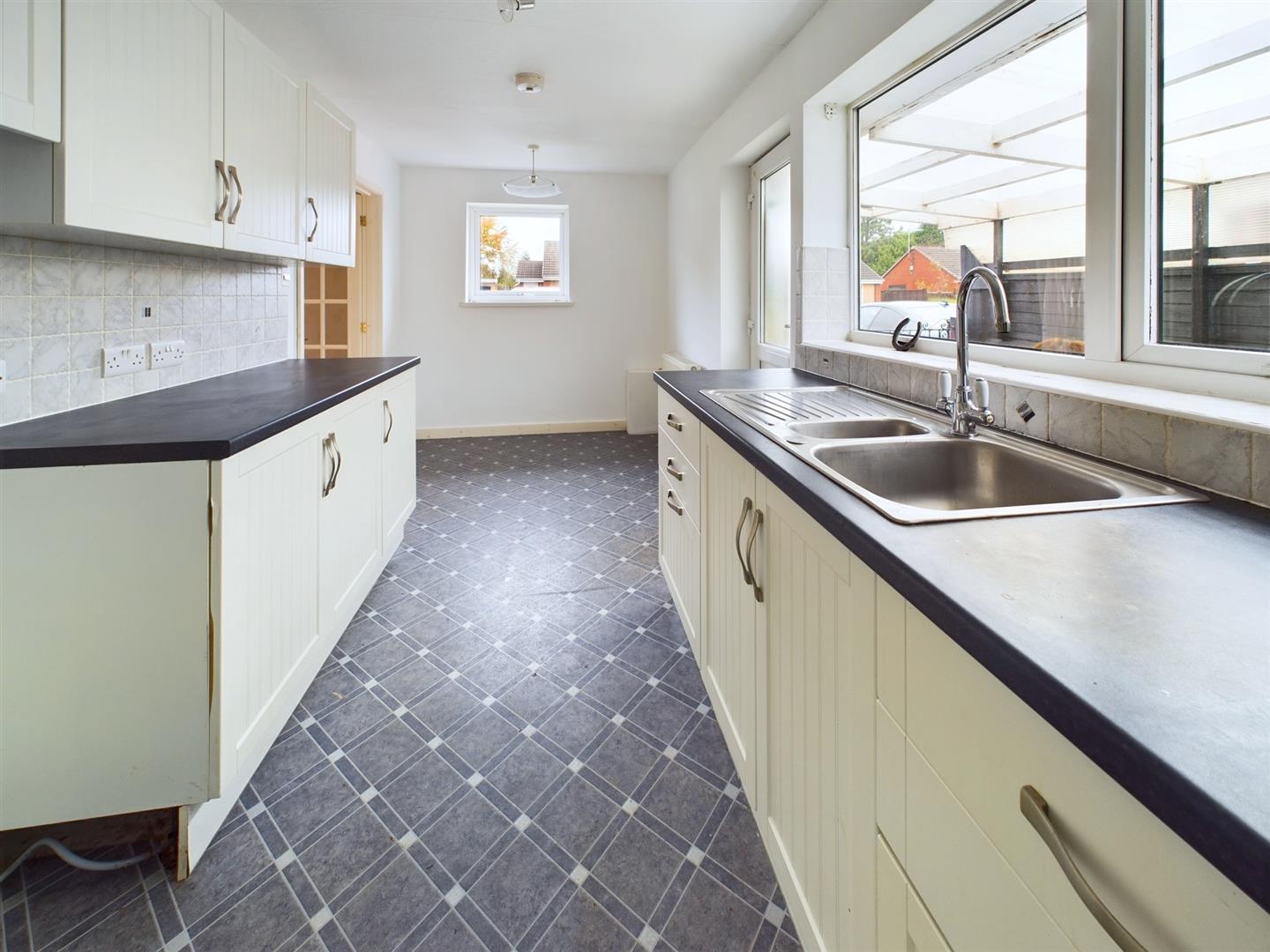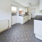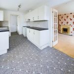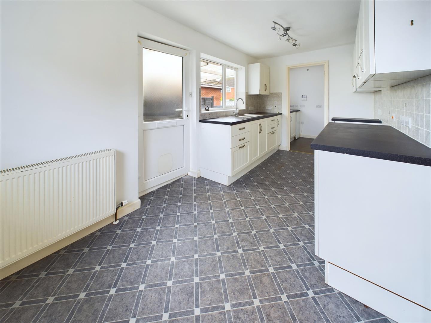 Fitted with a range of base cupboards and drawers with work surfaces over, matching eye level cupboards, one and a half bowl stainless steel sink with mixer tap under a uPVC double glazed window to the side, part tiled walls, radiator, uPVC double glazed window to the front aspect, glazed double doors to the sitting room and door to: