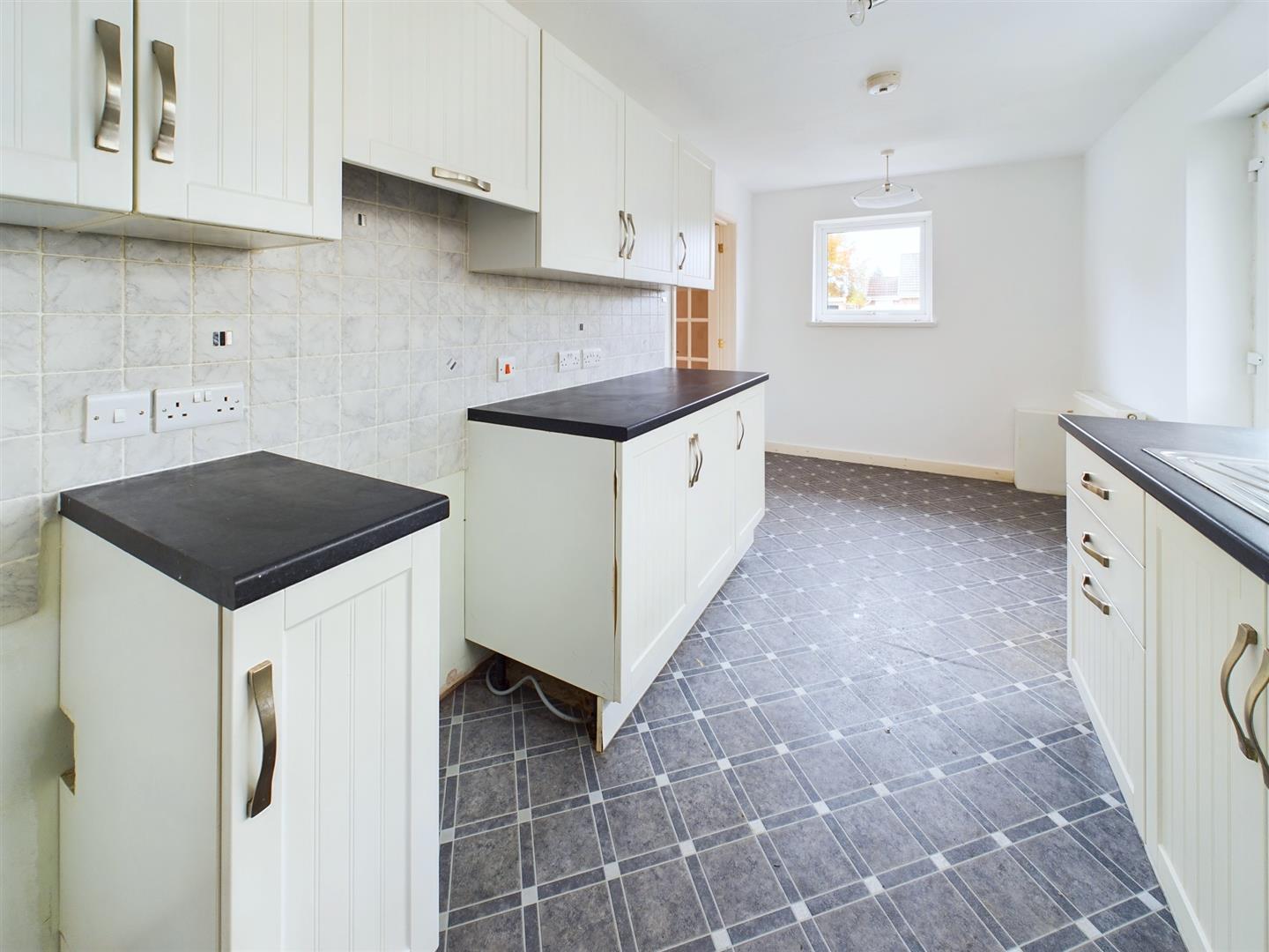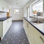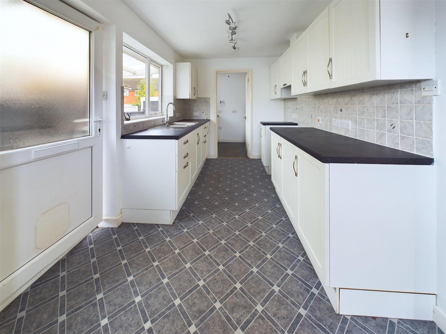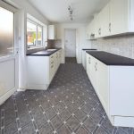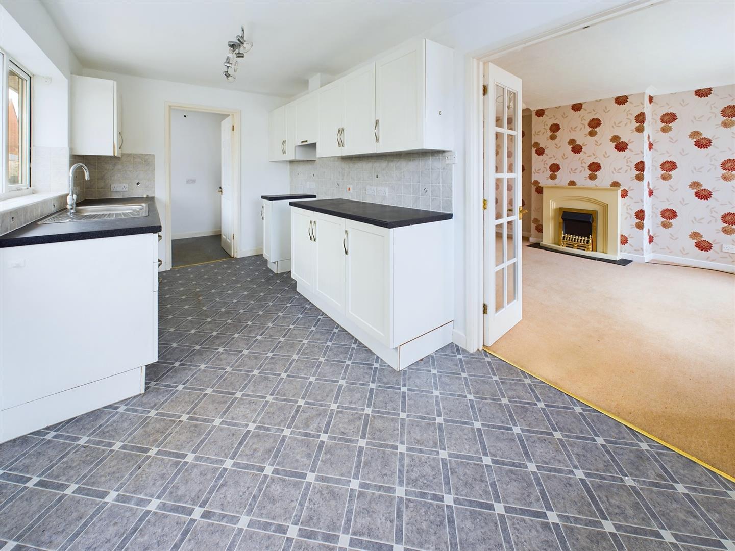 Fitted with a range of base cupboards and drawers with work surfaces over, matching eye level cupboards, one and a half bowl stainless steel sink with mixer tap under a uPVC double glazed window to the side, part tiled walls, radiator, uPVC double glazed window to the front aspect, glazed double doors to the sitting room and door to: