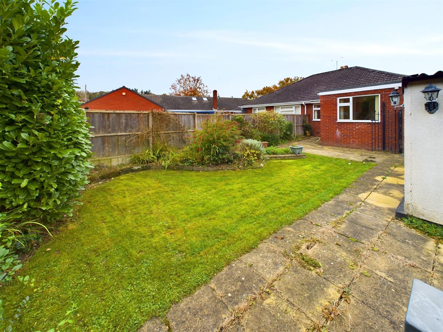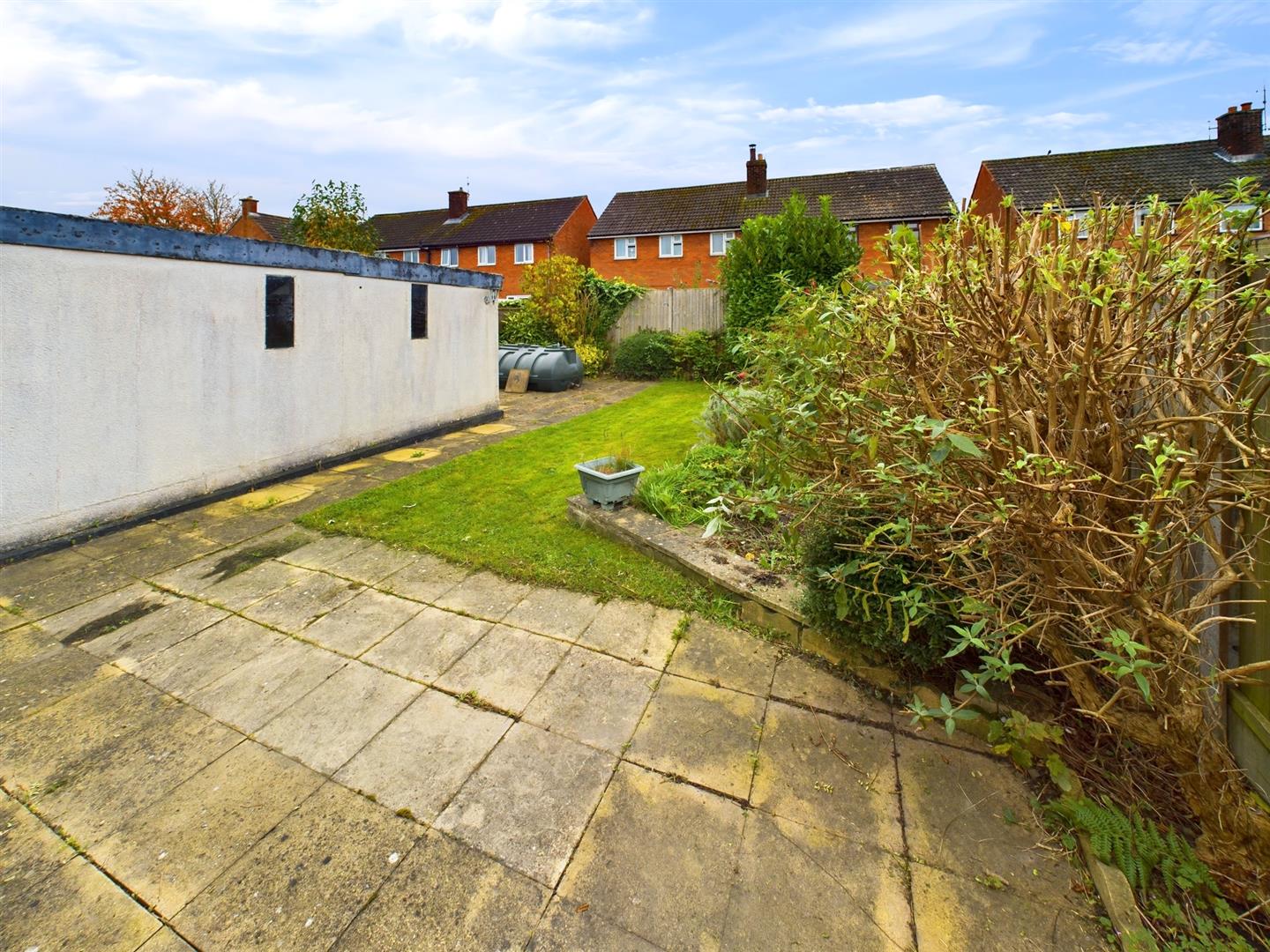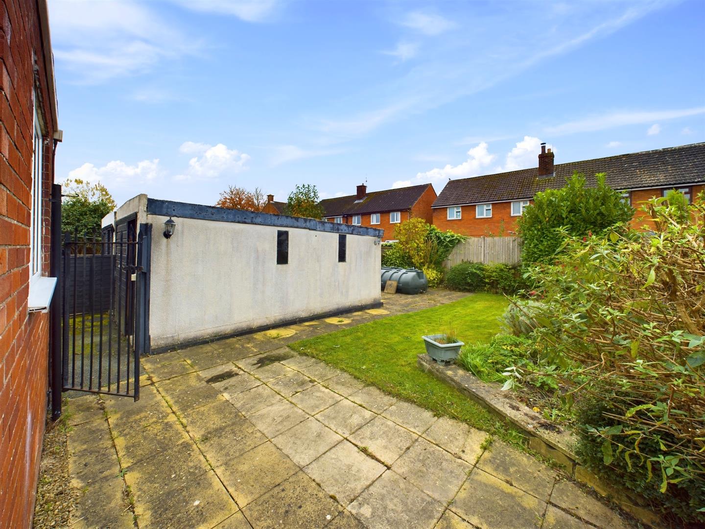 Patio entertainment area, laid to lawn with flower and shrub borders, oil tank, gate to driveway and bounded by panel fencing.