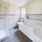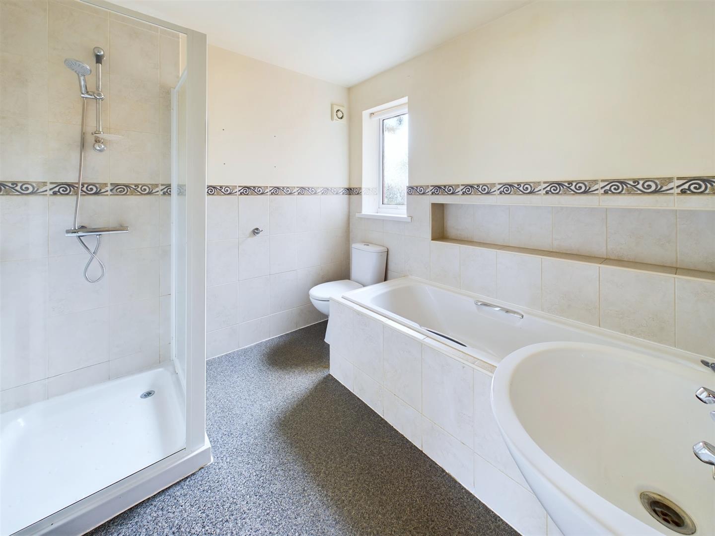 White suite comprising pedestal wash hand basin, low level W.C., panel bath and separate fully tiled shower cubicle, extractor fan, part tiled walls, display recess, radiator and uPVC double glazed window to the rear.