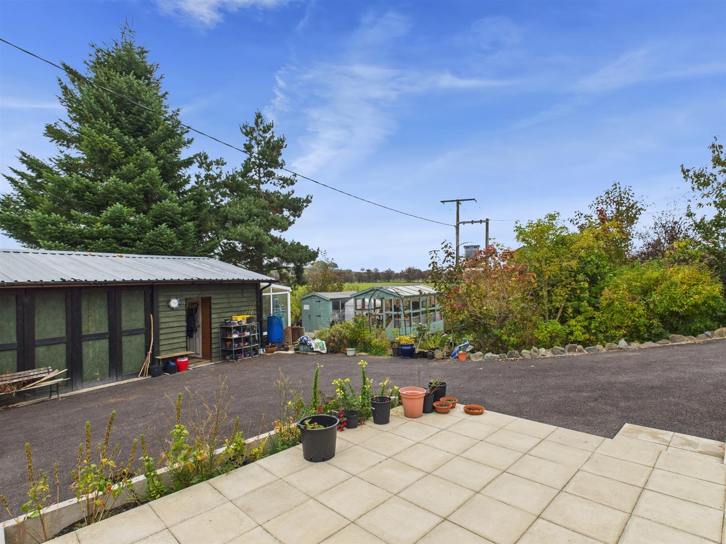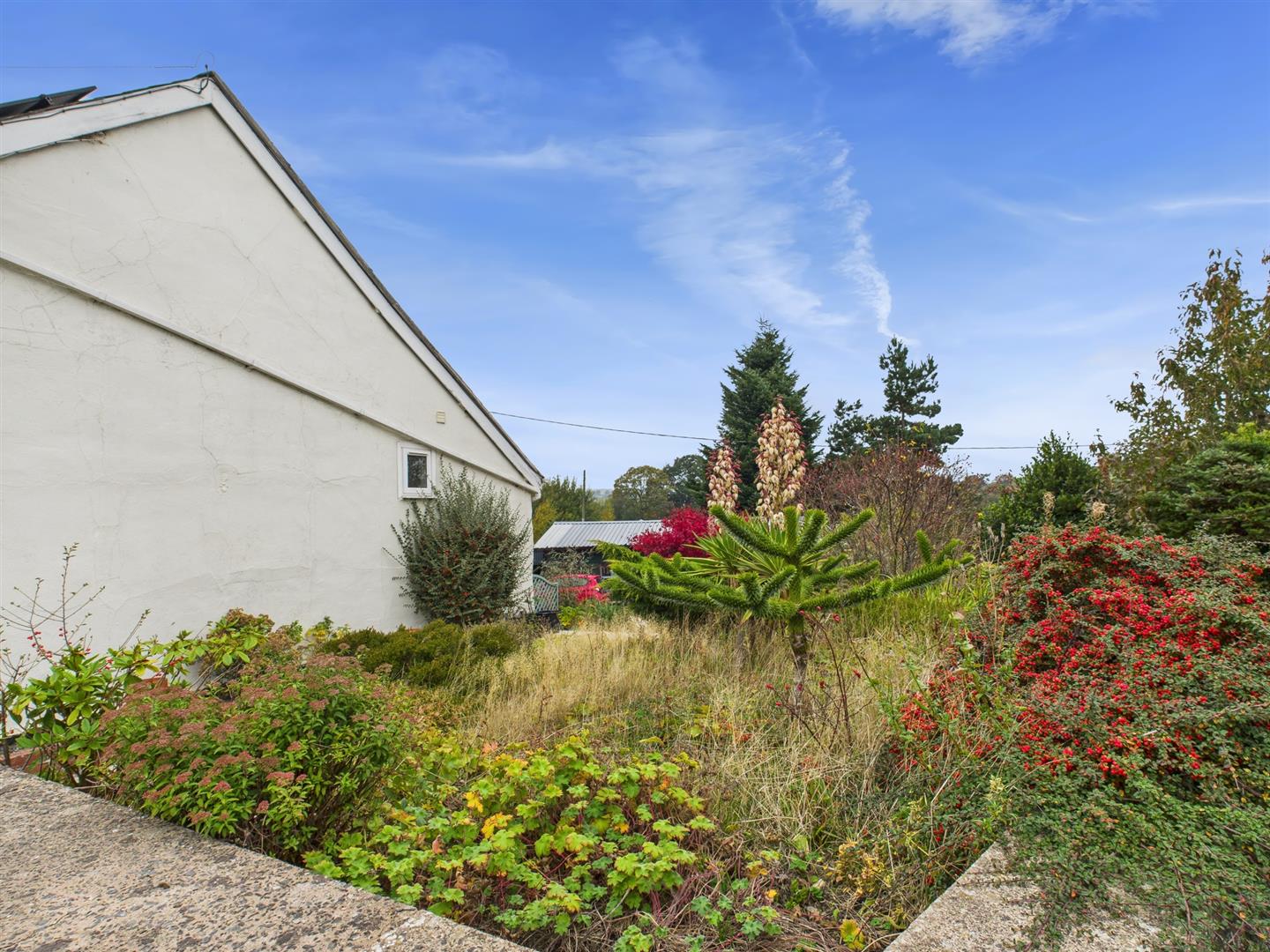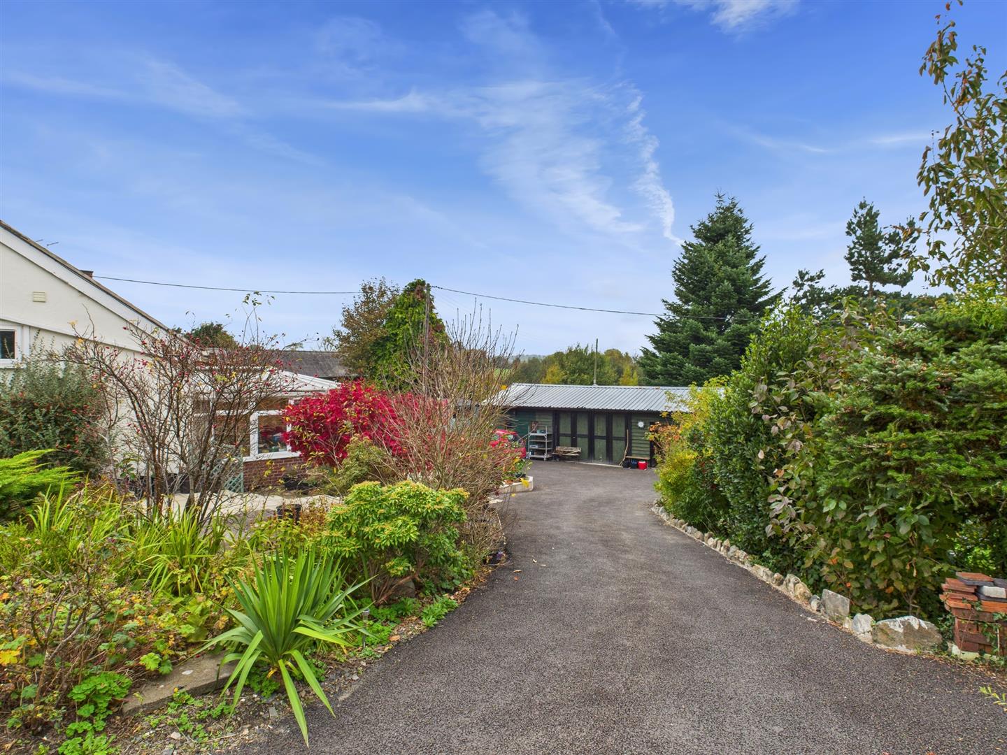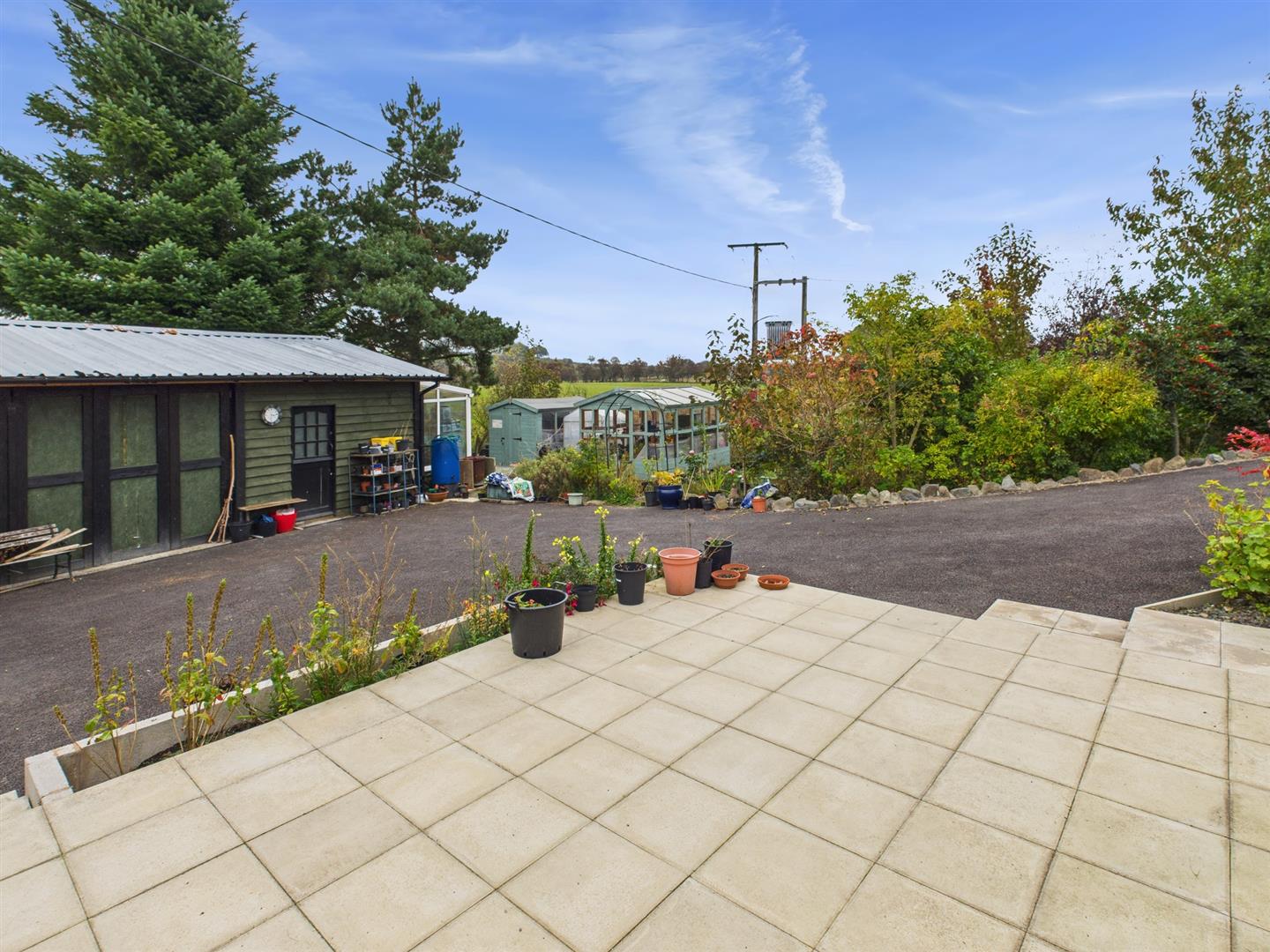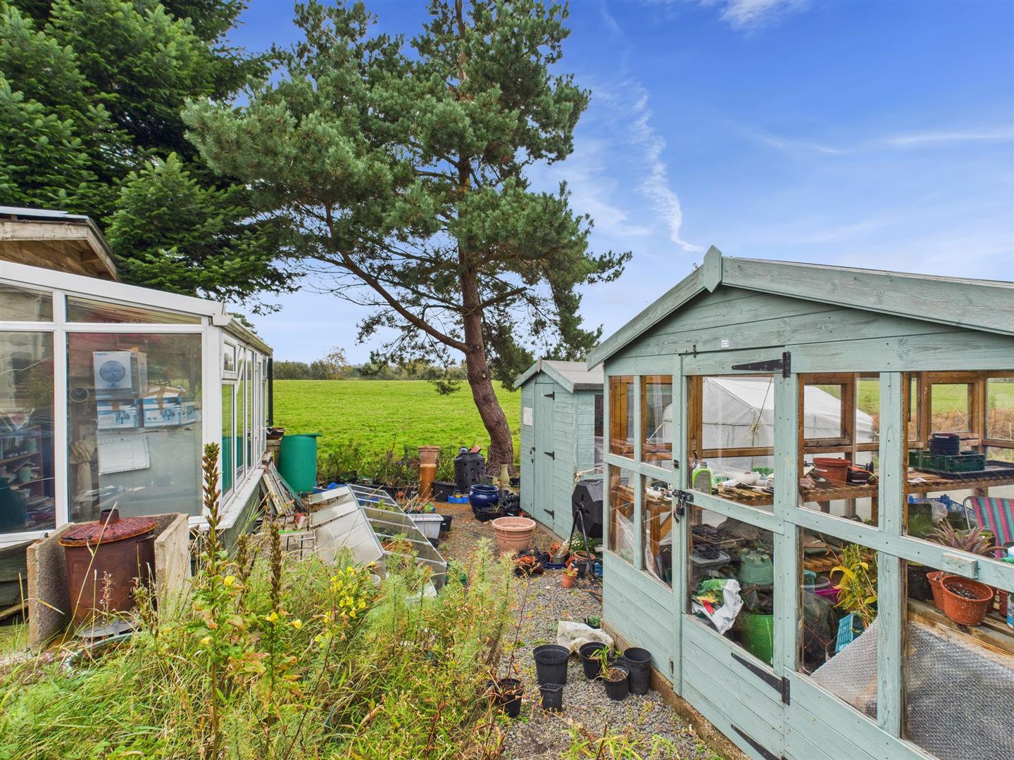 Brick wall and fencing to th4e front of the property. Gate and steps lead to a side garden with flowers and shrubs leading down to a paved patio entertainment area at the rear of the house. Leading onto a further covered patio area. Garden shed. Covered storage area. Driveway providing off road parking and turning space. Large garden shed/workshop with double doors with windows to either side. Greenhouse. Potting shed. Areas of garden with a selection of flowers, shrubs and a number of fruit trees including apple, pear and cherry.