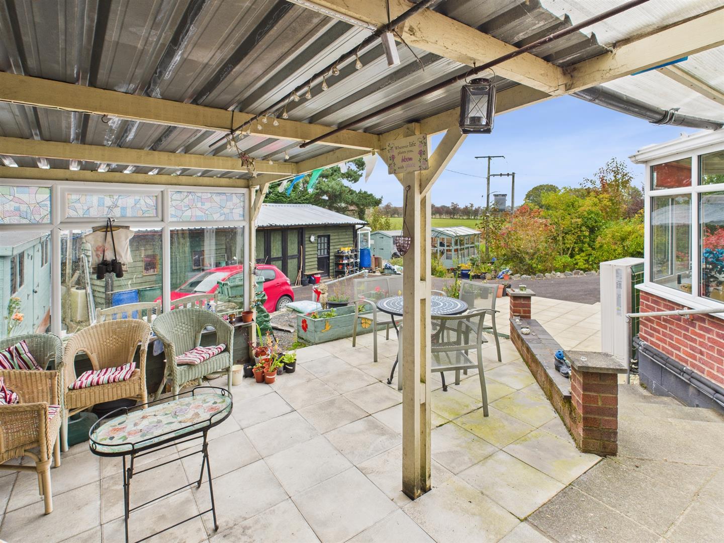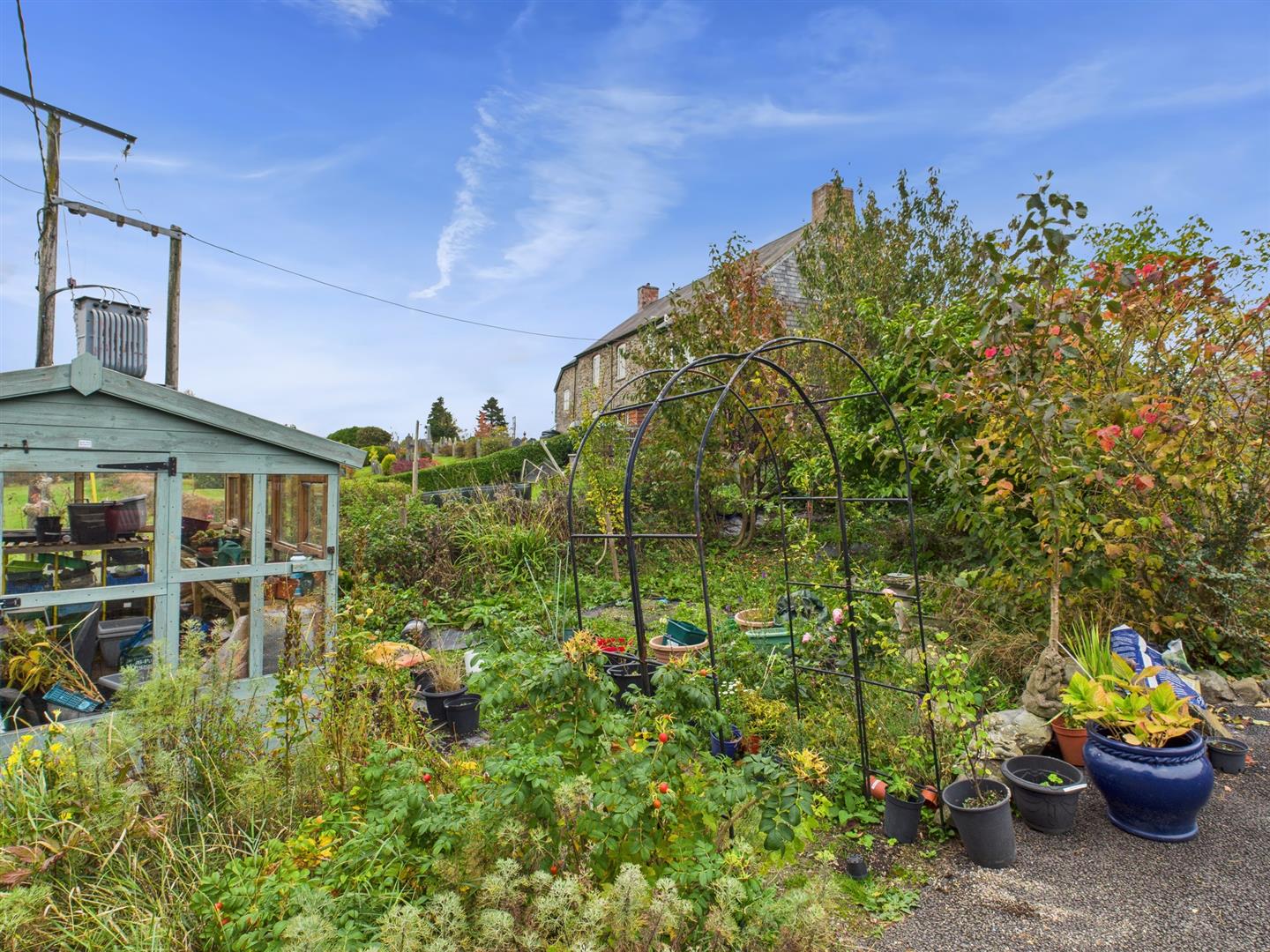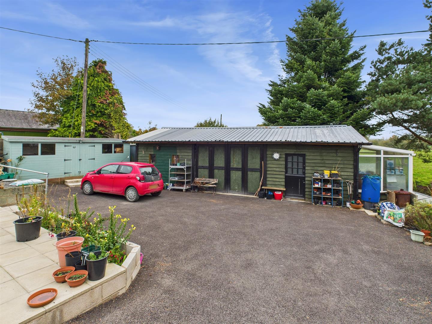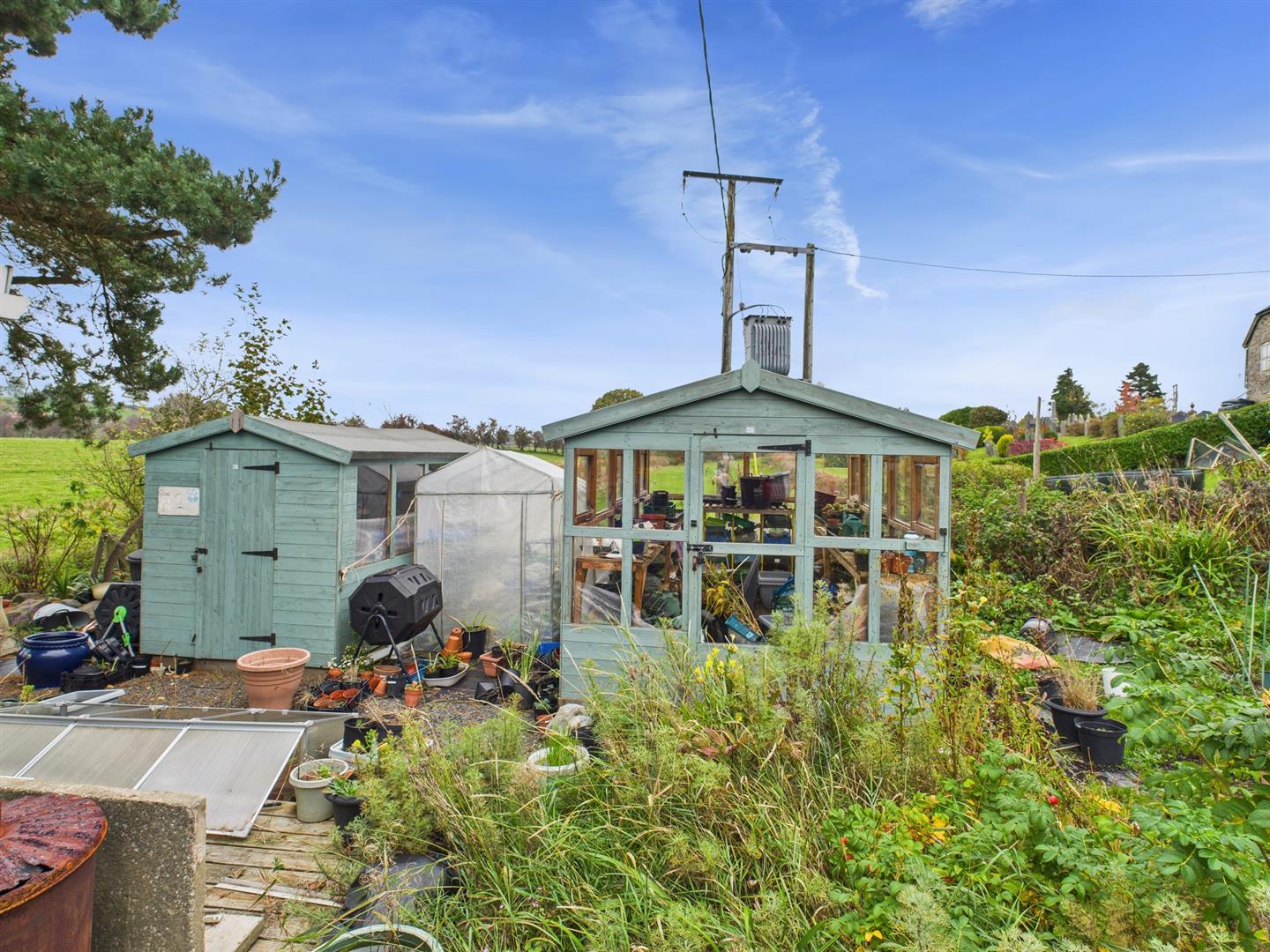 Brick wall and fencing to th4e front of the property. Gate and steps lead to a side garden with flowers and shrubs leading down to a paved patio entertainment area at the rear of the house. Leading onto a further covered patio area. Garden shed. Covered storage area. Driveway providing off road parking and turning space. Large garden shed/workshop with double doors with windows to either side. Greenhouse. Potting shed. Areas of garden with a selection of flowers, shrubs and a number of fruit trees including apple, pear and cherry.