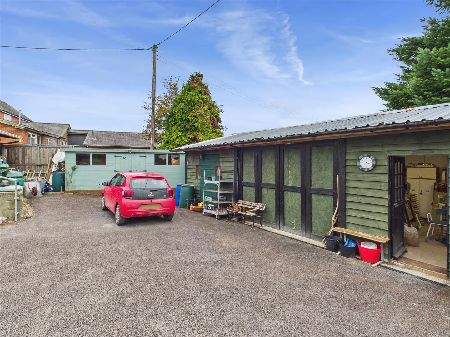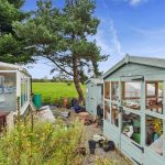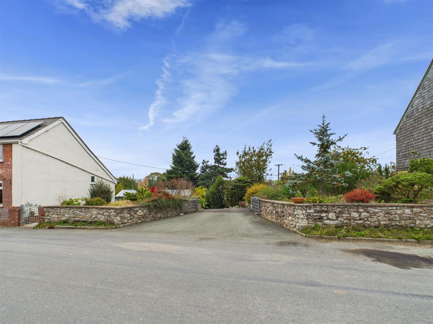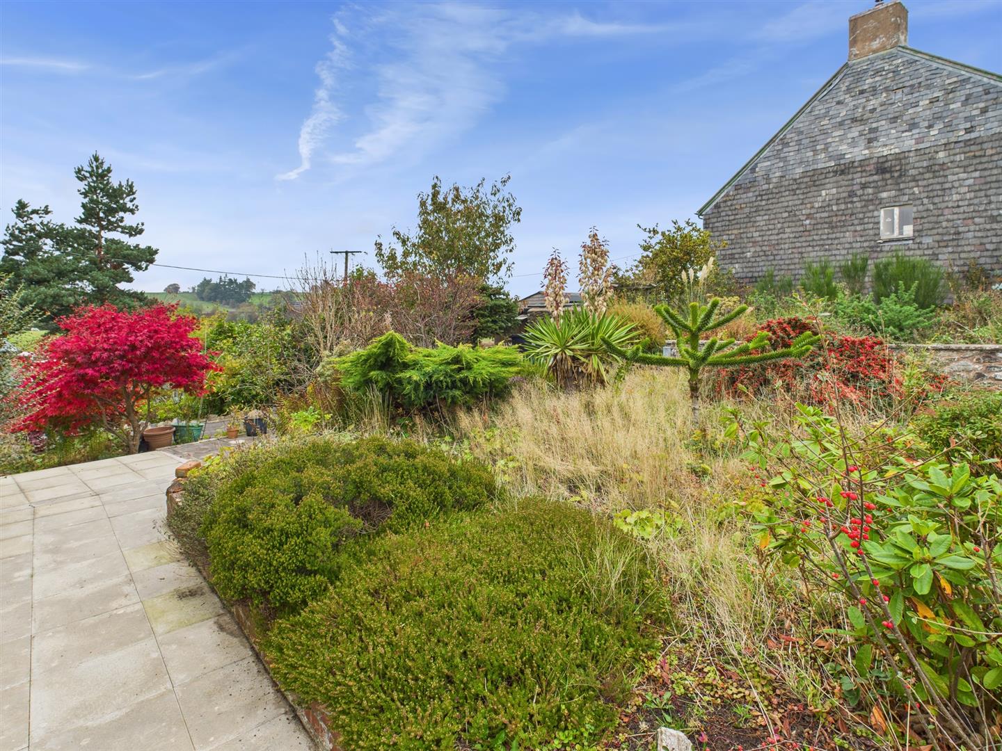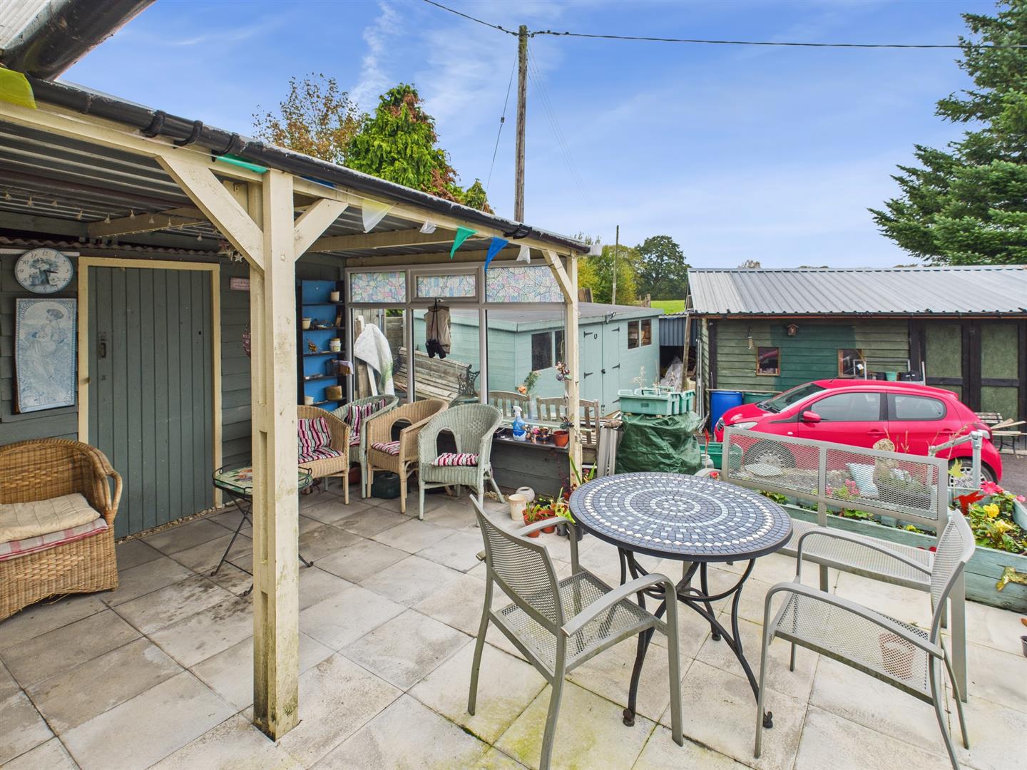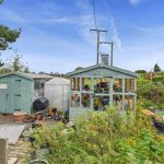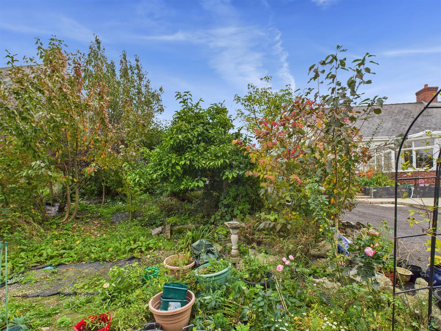 Brick wall and fencing to th4e front of the property. Gate and steps lead to a side garden with flowers and shrubs leading down to a paved patio entertainment area at the rear of the house. Leading onto a further covered patio area. Garden shed. Covered storage area. Driveway providing off road parking and turning space. Large garden shed/workshop with double doors with windows to either side. Greenhouse. Potting shed. Areas of garden with a selection of flowers, shrubs and a number of fruit trees including apple, pear and cherry.