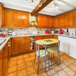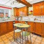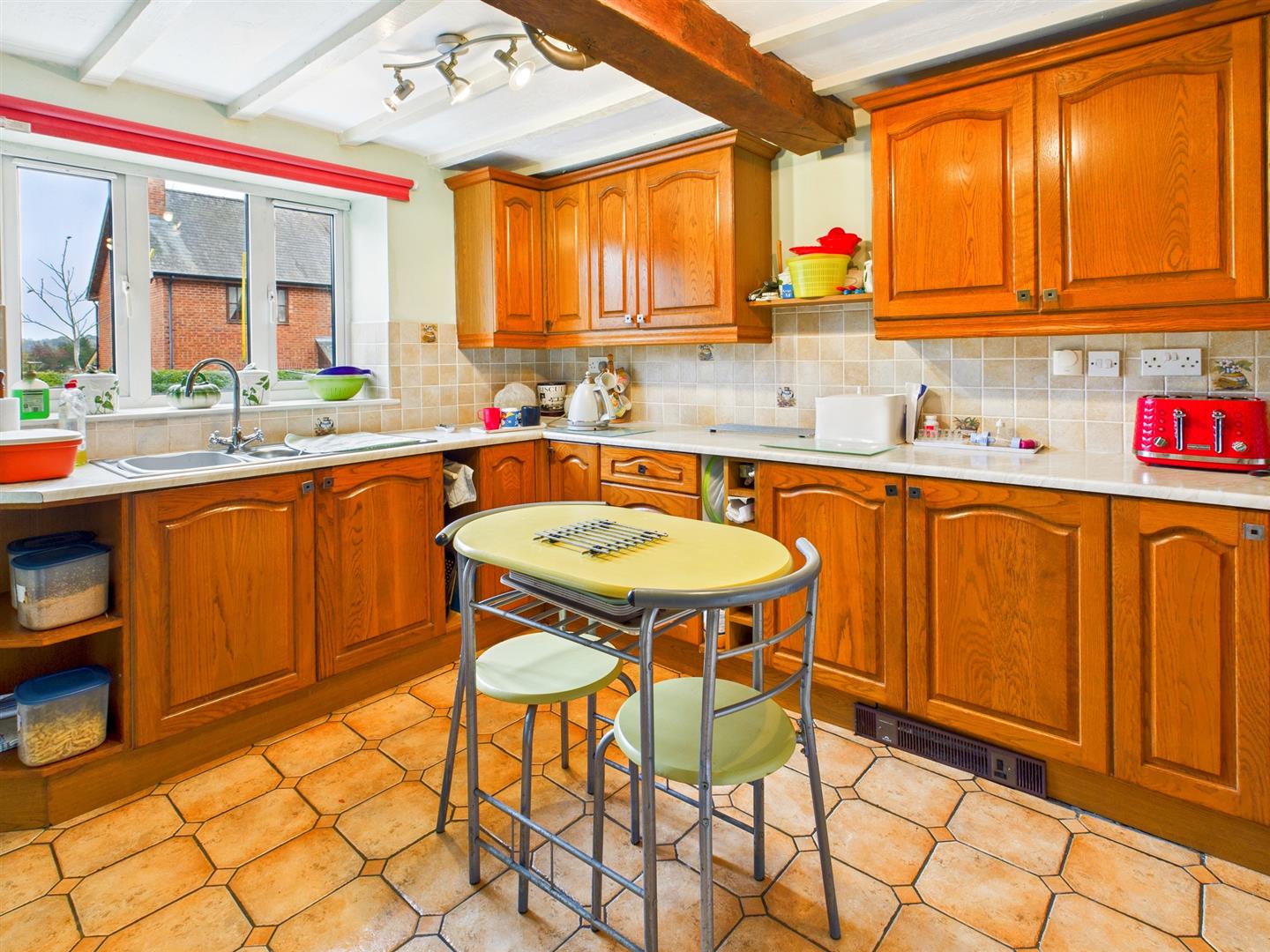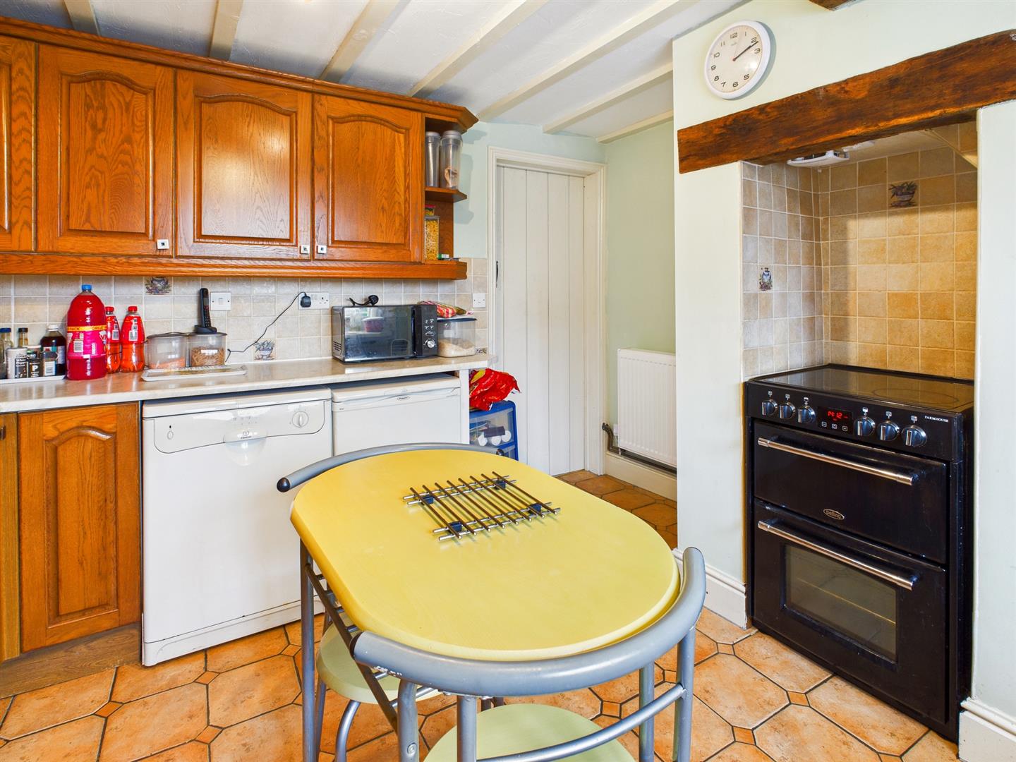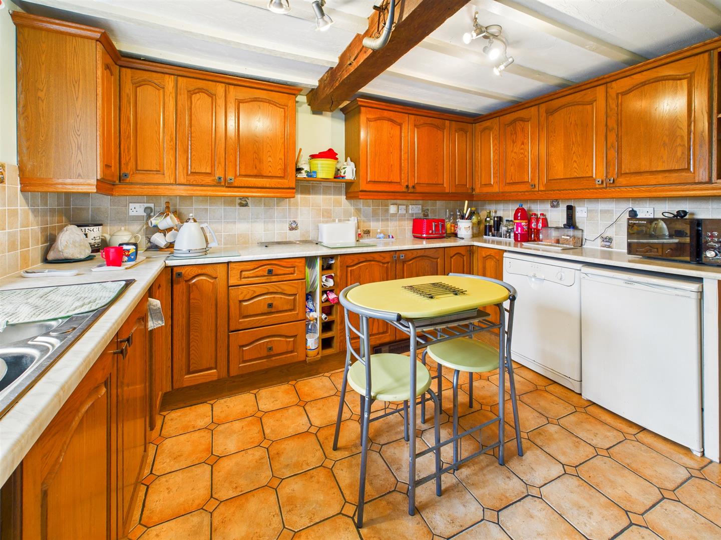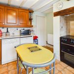 Fitted with a range of wood fronted base cupboards and drawers with work surfaces over, eye level cupboards, one and a half bowl stainless steel sink with mixer tap under a uPVC double glazed window to the front with views towards countryside, part tiled walls, end display shelving, wine rack, under counter appliance space, tiled floor, tiled recess with space for cooker, exposed beams, radiator and door to: