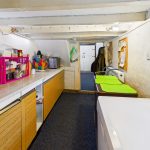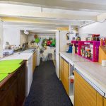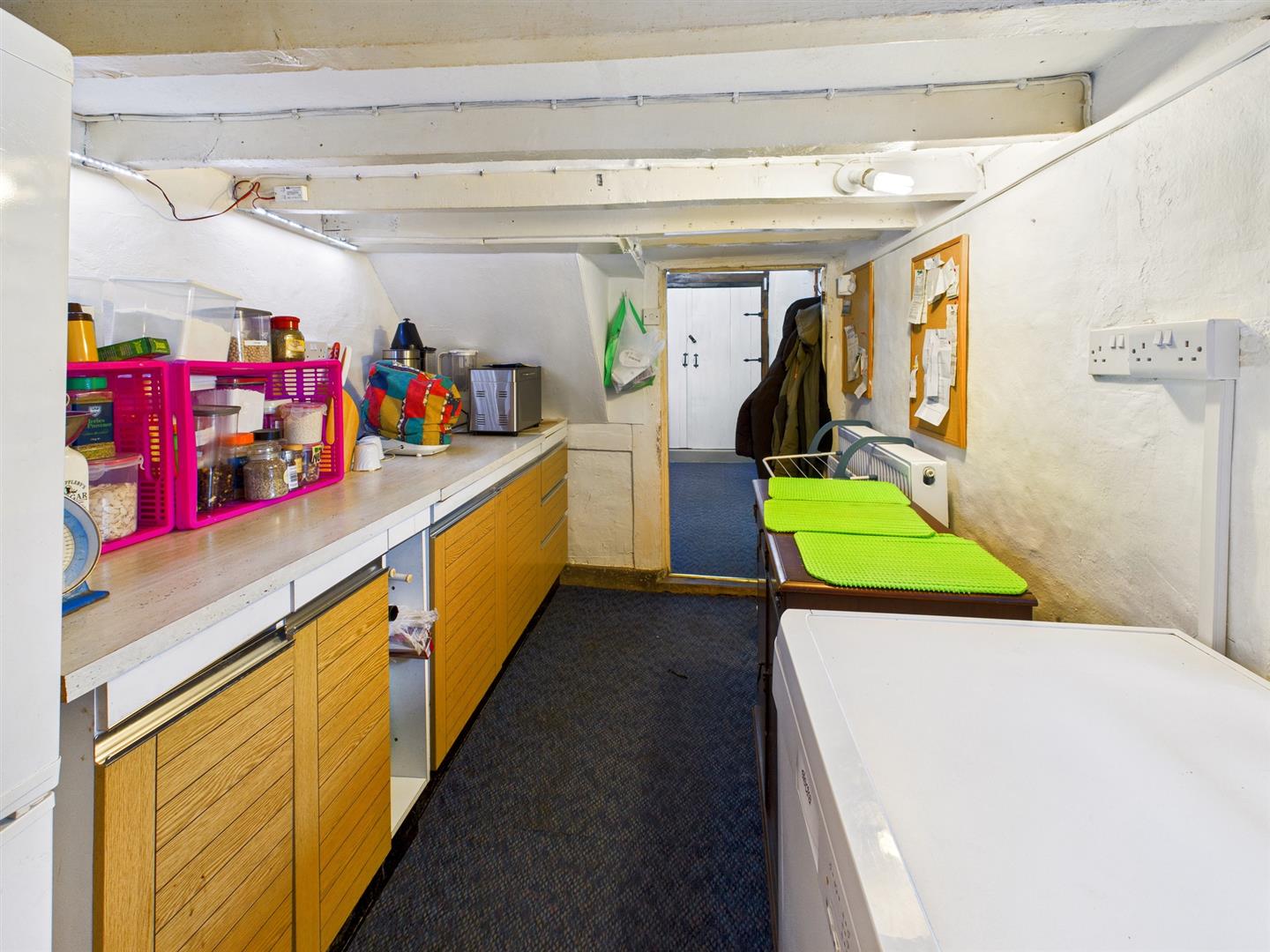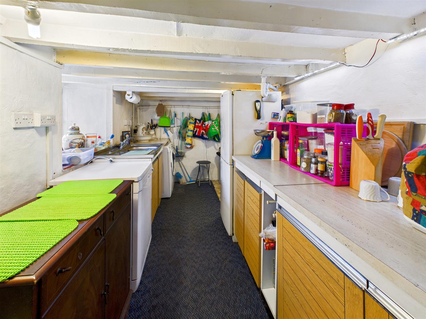 Fitted with a range of base cupboards and drawers with work surfaces over, stainless steel sink with mixer tap, radiator, plumbing and space for washing machine, further appliance space. Restricted head height.