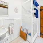 Low level W.C., pedestal wash hand basin with mixer tap, walk in shower cubicle with Triton electric shower, radiator, heated towel rail and uPVC double glazed window to the rear.