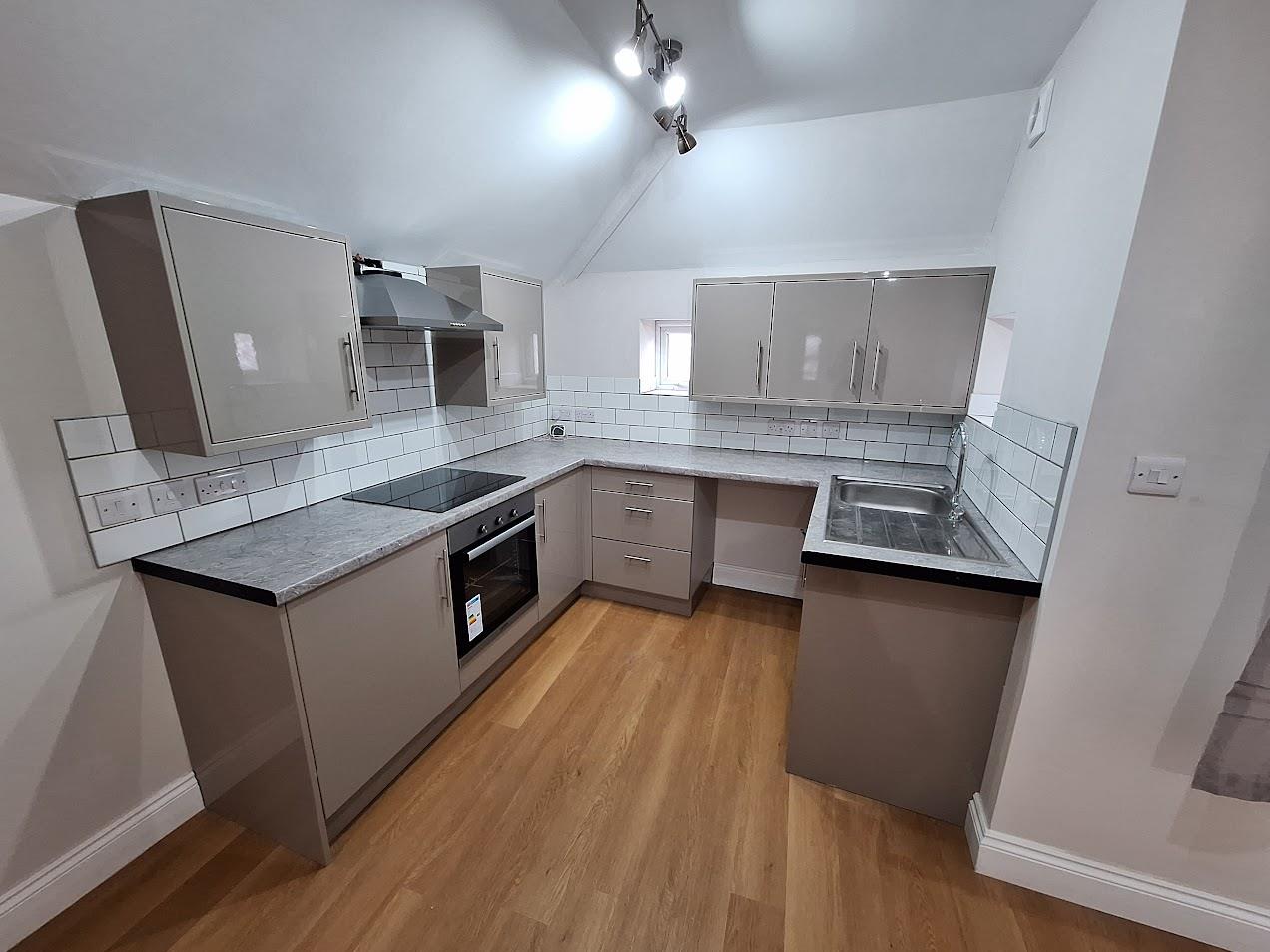 A newly renovated second-floor flat featuring an open-plan living room / kitchen, one double bedroom, and a modern shower room. Accessed via a communal entrance.