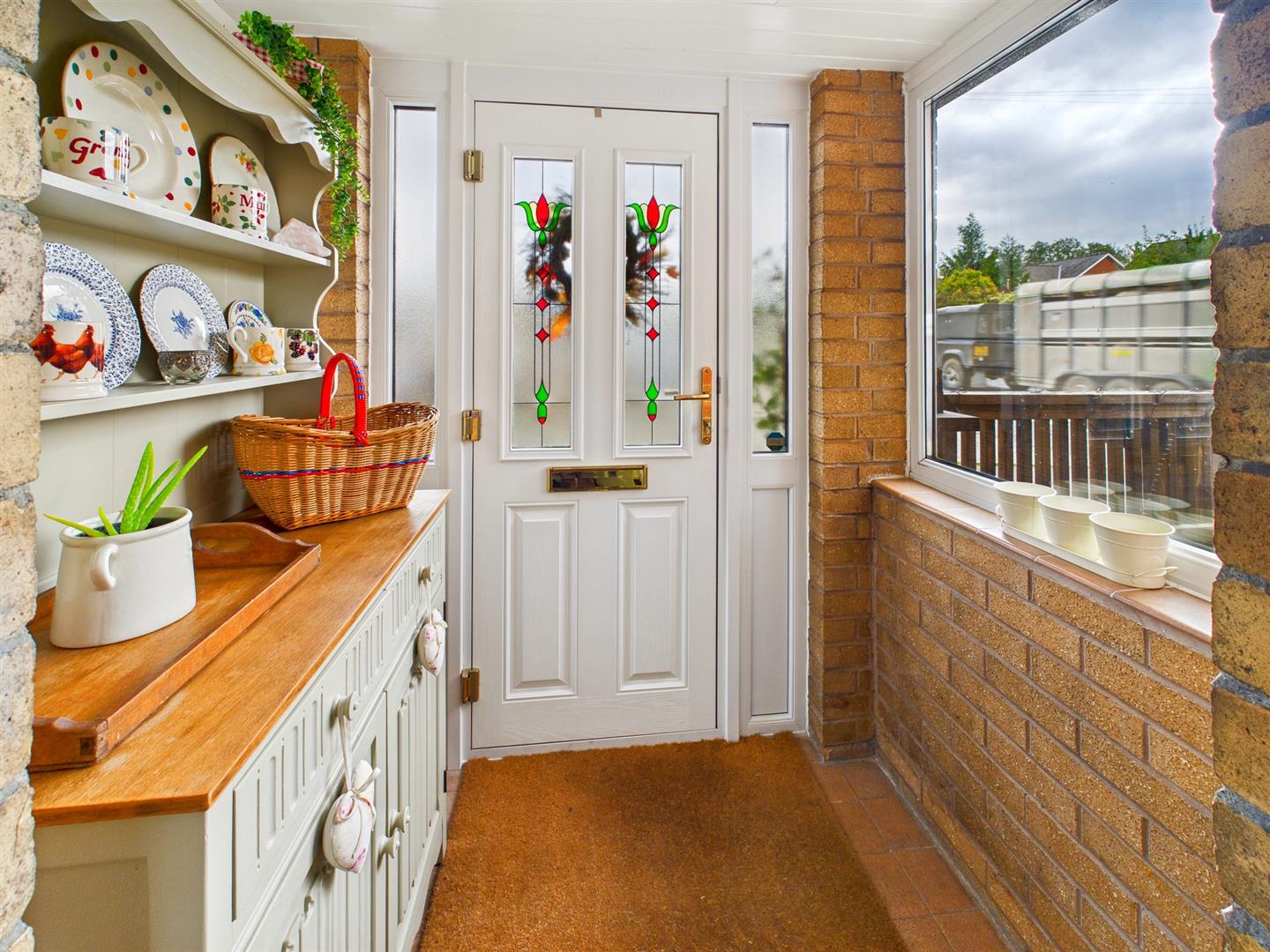 Approached from the driveway and having a uPVC double glazed window to the front, wood panelling and a composite door and side screen to the front.