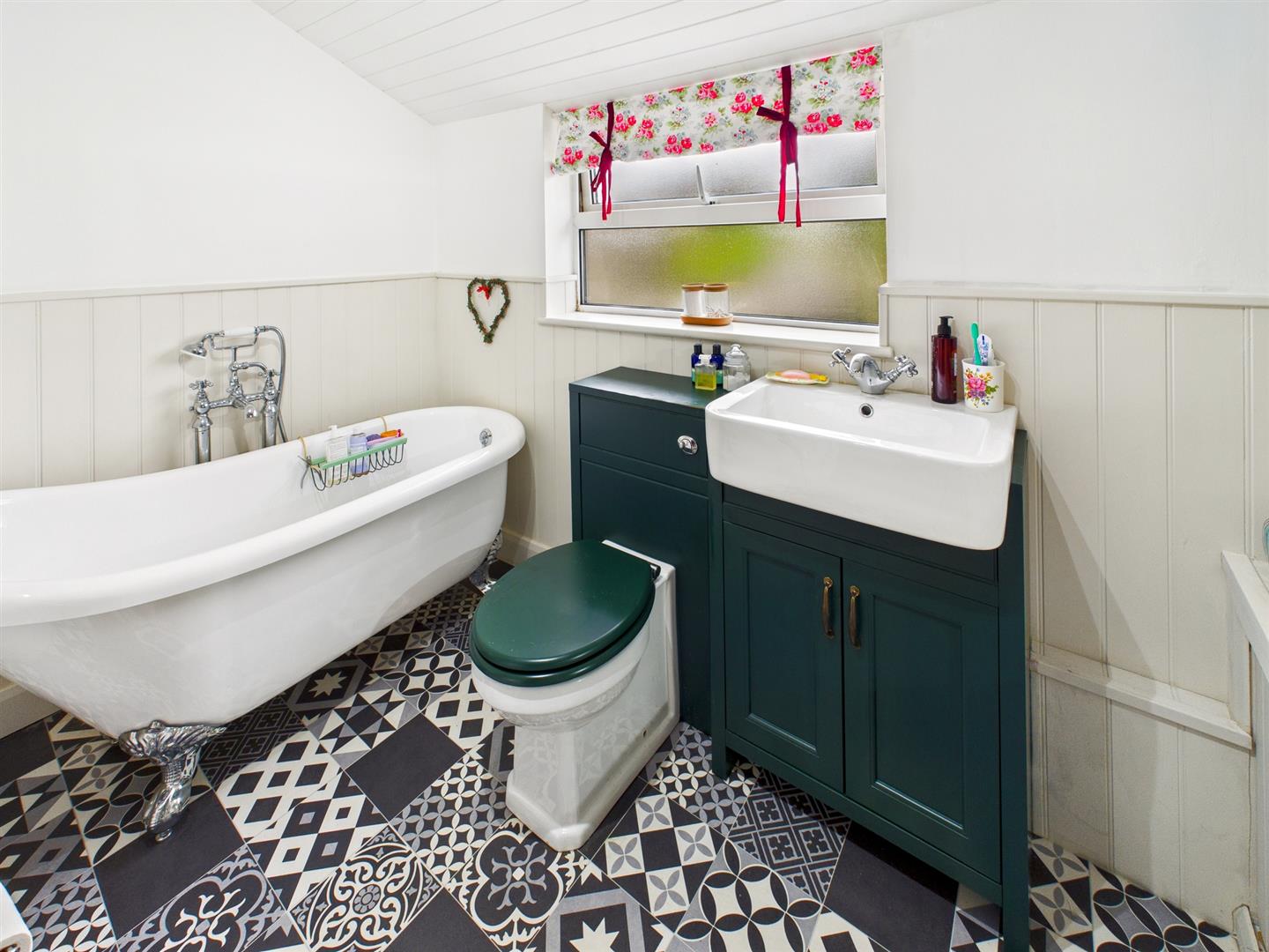 Steps down to the re fitted bathroom with freestanding roll top bath with mixer tap and shower attachment, vanity unit with W.C. and wash hand basin with mixer tap and cupboards below, wood panelling, exposed brickwork, useful seat with storage under, heated towel rail and uPVC double glazed window to the rear aspect.