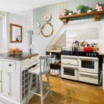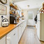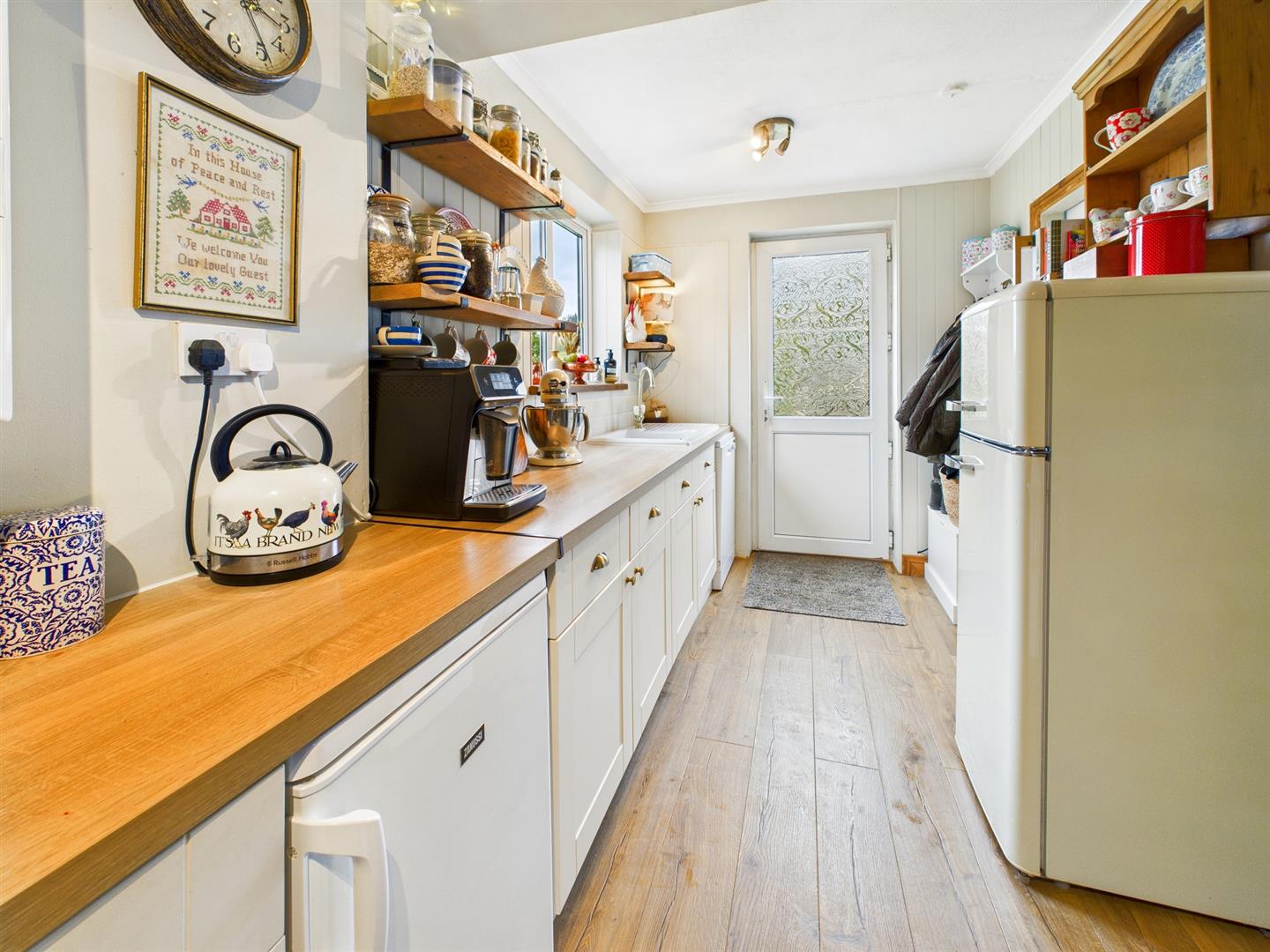 Newly fitted with a range of base cupboards and drawers with work surfaces over, display shelving, butler style sink with mixer tap, part tiled splashbacks, wood panelling and splashbacks, wall mounted central heating boiler, plumbing and space for dishwasher, space for under counter fridge, further appliance space, radiator, recess for range style cooker with tiled surround, wood effect flooring, uPVC double glazed window to the rear with views towards open countryside. Doors to the cellar, salon and: