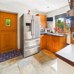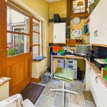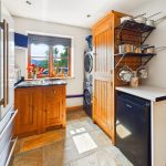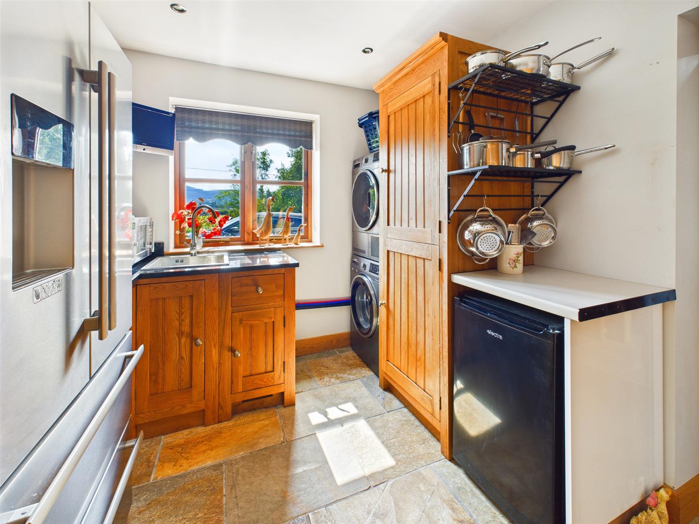 With base cupboards with granite work surfaces over, matching eye level cupboards, tall storage cupboard, tiled floor, appliance space and space for American style fridge/freezer, square stainless steel sink with mixer tap. Stable door to the side and doors to cloakroom and LARDER- with base cupboards with work surface over, eye level cupboards and shelving, wall mounted boiler.