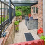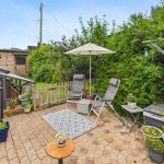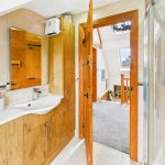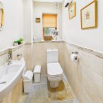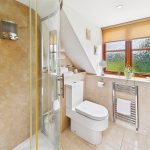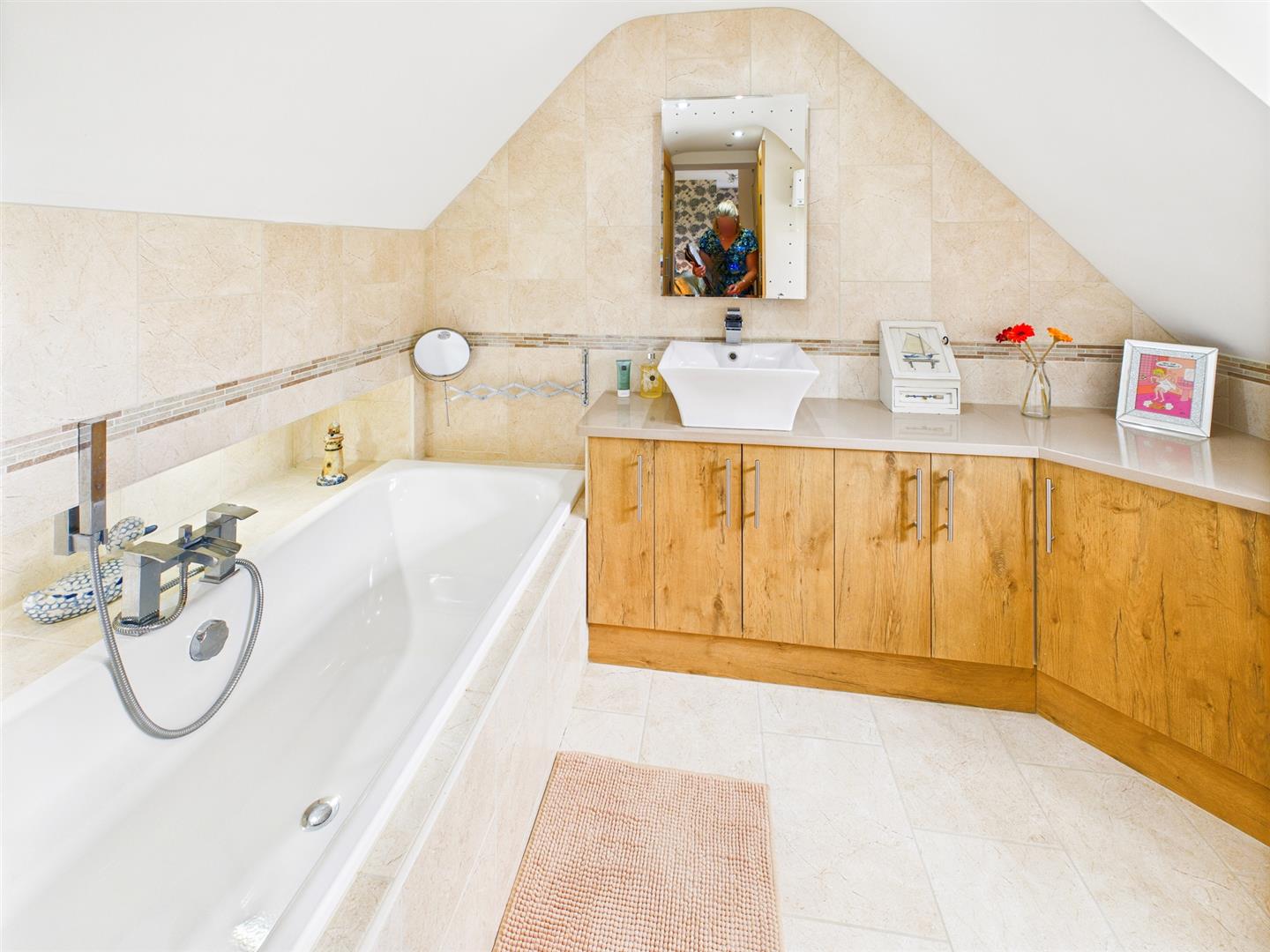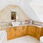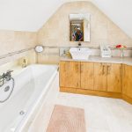 Airing cupboard with radiator and slatted shelving, built in cupboard with tank. Suite comprising bath with central mixer tap and shower attachment and tiled recess, low level W.C., vanity unit with granite top, square basin, mixer tap and cupboards under, heated mirror, window to the front, tiled walls and floor and heated towel rail.