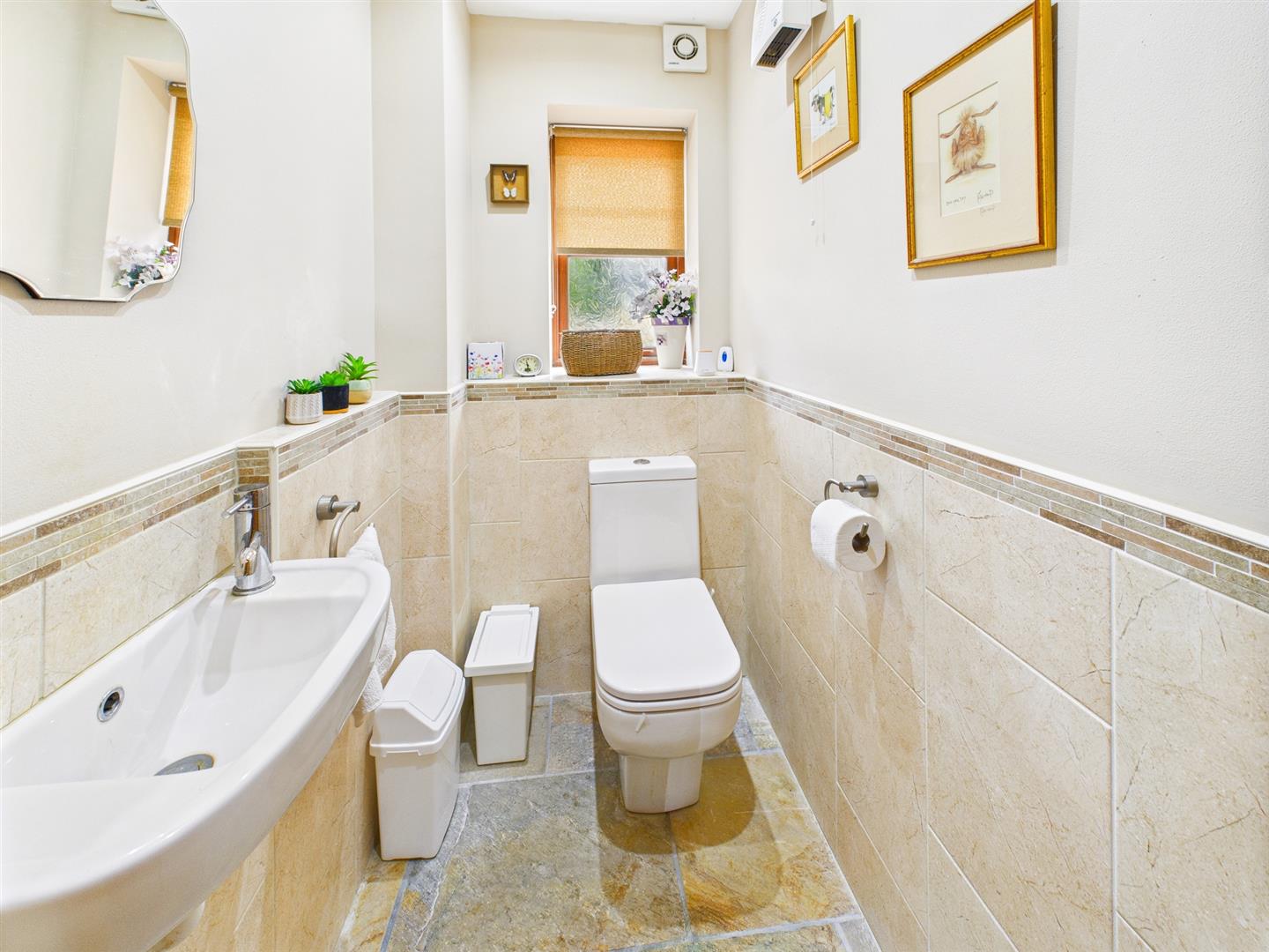 Suite comprising low level W.C., wall mounted wash hand basin with mixer tap, part tiled walls and tiled floor and window to the rear.
