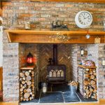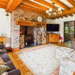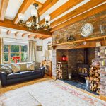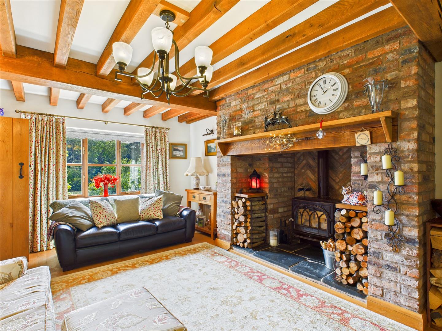 Window to the front with views towards open countryside, oak flooring, exposed beams, brick fireplace with wood mantle, slate hearth and inset log burner. Double doors to: