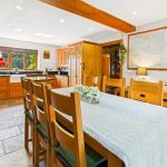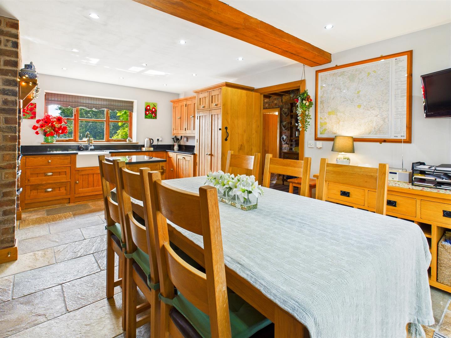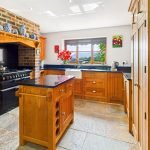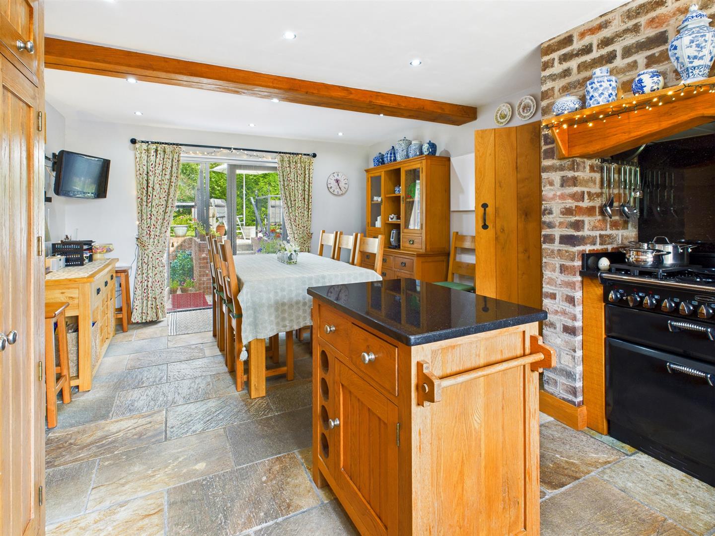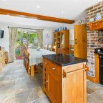 Fitted with a range of wood fronted base cupboards and drawers with granite work surfaces over, matching eye level cupboards, double larder cupboard, white Belfast sink with mixer tap under a window to the front with views towards open countryside, integrated dishwasher, brick fireplace with inset Rangemaster cooker with 5 gas hobs and double oven and grill with concealed extractor hood over and wooden mantle. Exposed beams, tiled floor and French doors to the rear garden. Door to: