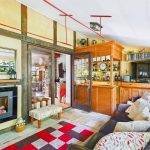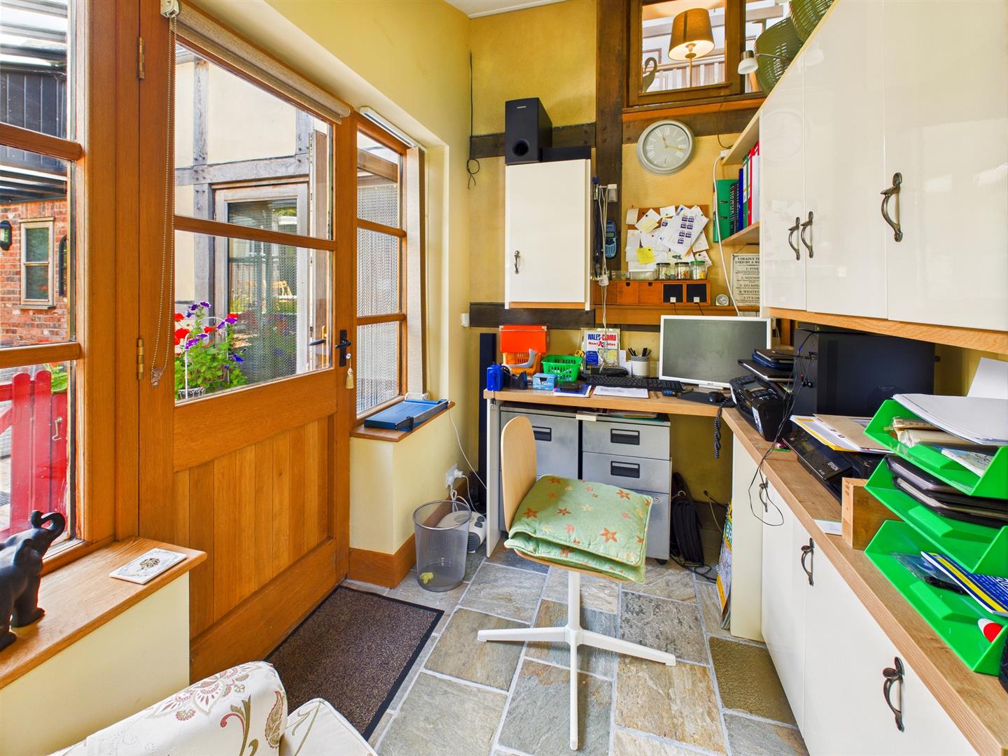 Built in oak bar with shelving and built in cupboards to one side, tiled floor, windows to the rear, exposed trusses and door to: