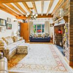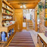 Oak flooring, exposed brickwork and beams and staircase to the first floor with large storage cupboard under.