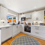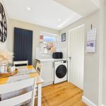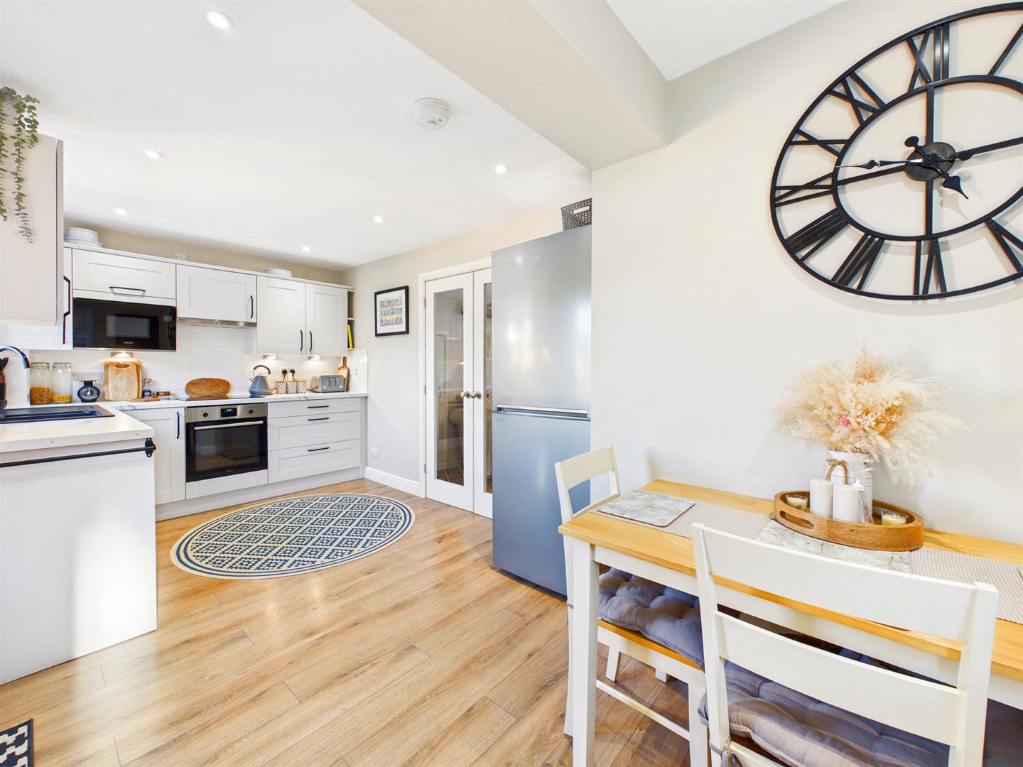 Fitted with a range of shaker style units incorporating 1 1/2 bowl sink with mixer tap. Range of matching base units comprising cupboards and drawers with work surfaces over. Inset 4 ring Zanussi hob with AEG extractor hood over and Zanussi oven beneath, matching range of eye level wall units with under cabinet lights, built in dishwasher and Zanussi microwave and space and plumbing for a washing machine. The room features wooden style flooring, a rear facing window overlooking the garden, and a UPVC double glazed door providing access to the rear garden.