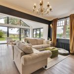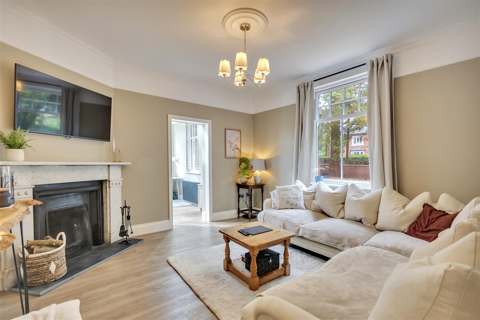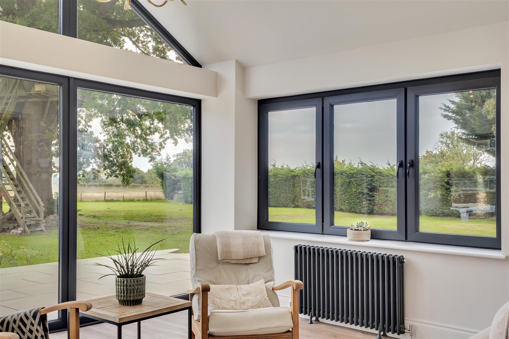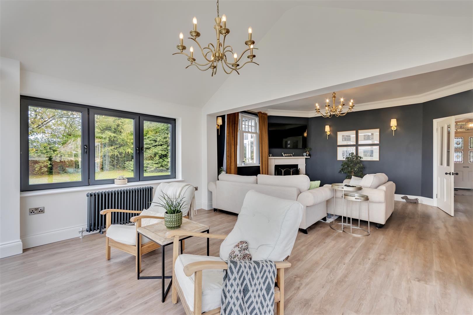 The impressive living and garden room is a truly inviting and versatile space that forms the heart of the home. Generously proportioned and flooded with natural light, this beautiful room features vaulted ceilings, adding a sense of grandeur and openness while highlighting the room’s unique architectural character. The open fireplace, set within a traditional surround, offers a warm and cosy focal point—perfect for relaxing evenings or entertaining in style. Large windows and glazed doors frame sweeping views of the rear garden, drawing the outdoors in and providing a stunning backdrop in every season. Whether you're hosting guests, enjoying family time, or simply unwinding with a book by the fire, this exceptional living room effortlessly balances elegance with comfort.