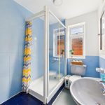 Providing a suite comprising of low level WC, pedestal wash hand basin and walk in shower cubicle with splash screen and curtain and mains fed shower. Part tiled walls, wall mounted electric heater.