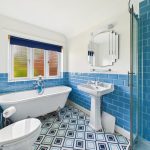 Attractively refitted with a suite comprising of low level WC, pedestal wash hand basin, corner shower tray with folding glass doors and roll top bath with claw feet, part tiled walls. Window to side.