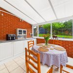 With tiled floor and providing a further range of base level storage cupboards and fitted work surface. Plumbing points under the work surface for dishwasher and washing machine. Wrap around UPVC double glazed windows and polycarbonate roof, glazed access door leading to the attractive rear gardens beyond.