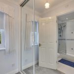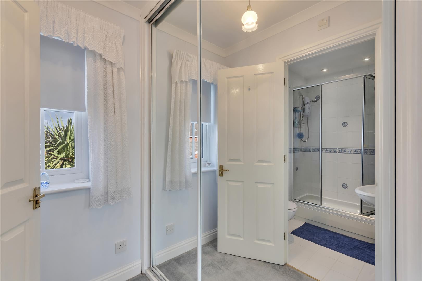 Tiled flooring, half-tiled walls, front aspect uPVC double-glazed privacy window, large built-in shower unit with electric shower, wc, pedestal hand wash basin, and one radiator.