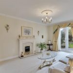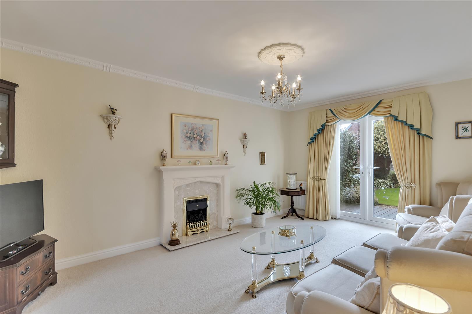 Carpet flooring, front aspect double-glazed wooden frame bay window, rear aspect French Doors to decking area, gas flame effect fire with ornate mantle surround, and two radiators.