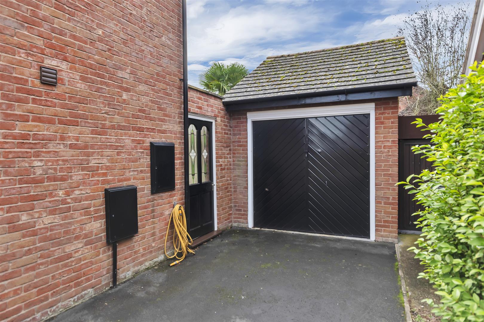 Painted concrete floor, rear aspect wooden frame internal window, manual up-and-over door, wood frame pedestrian door, workbench, and a boarded loft space with a fixed wooden ladder. There are large covered storage spaces to the rear and the side of the garage.