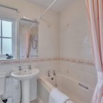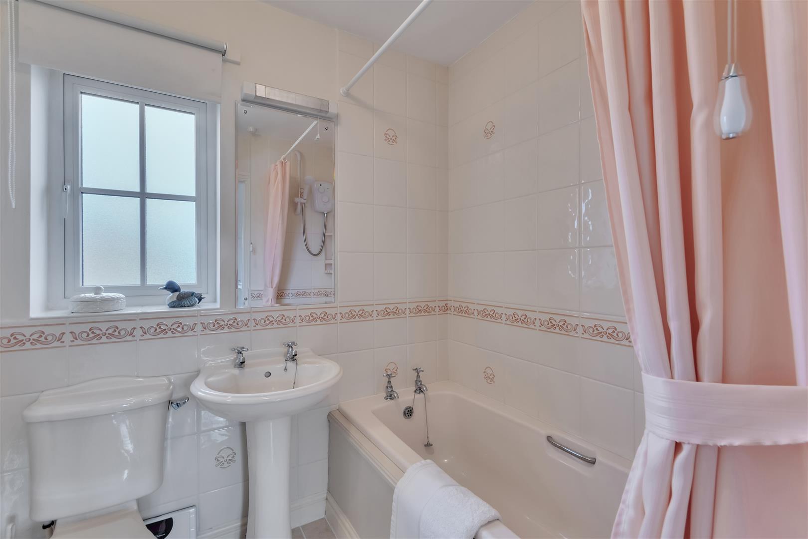 Tiled floor, half-tiled walls, front aspect uPVC double -glazed privacy window, matching suite with fitted bath with an electric shower over, wc and pedestal sink, and one radiator.
