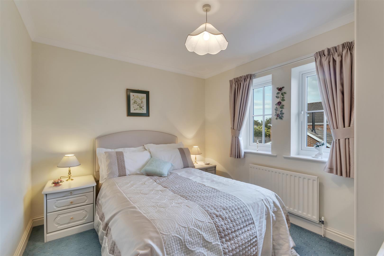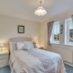 Double bedroom with carpet flooring, two front aspect uPVC double-glazed windows, fitted double wardrobe with attached dressing table and two matching bedside tables, and one radiator.