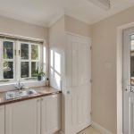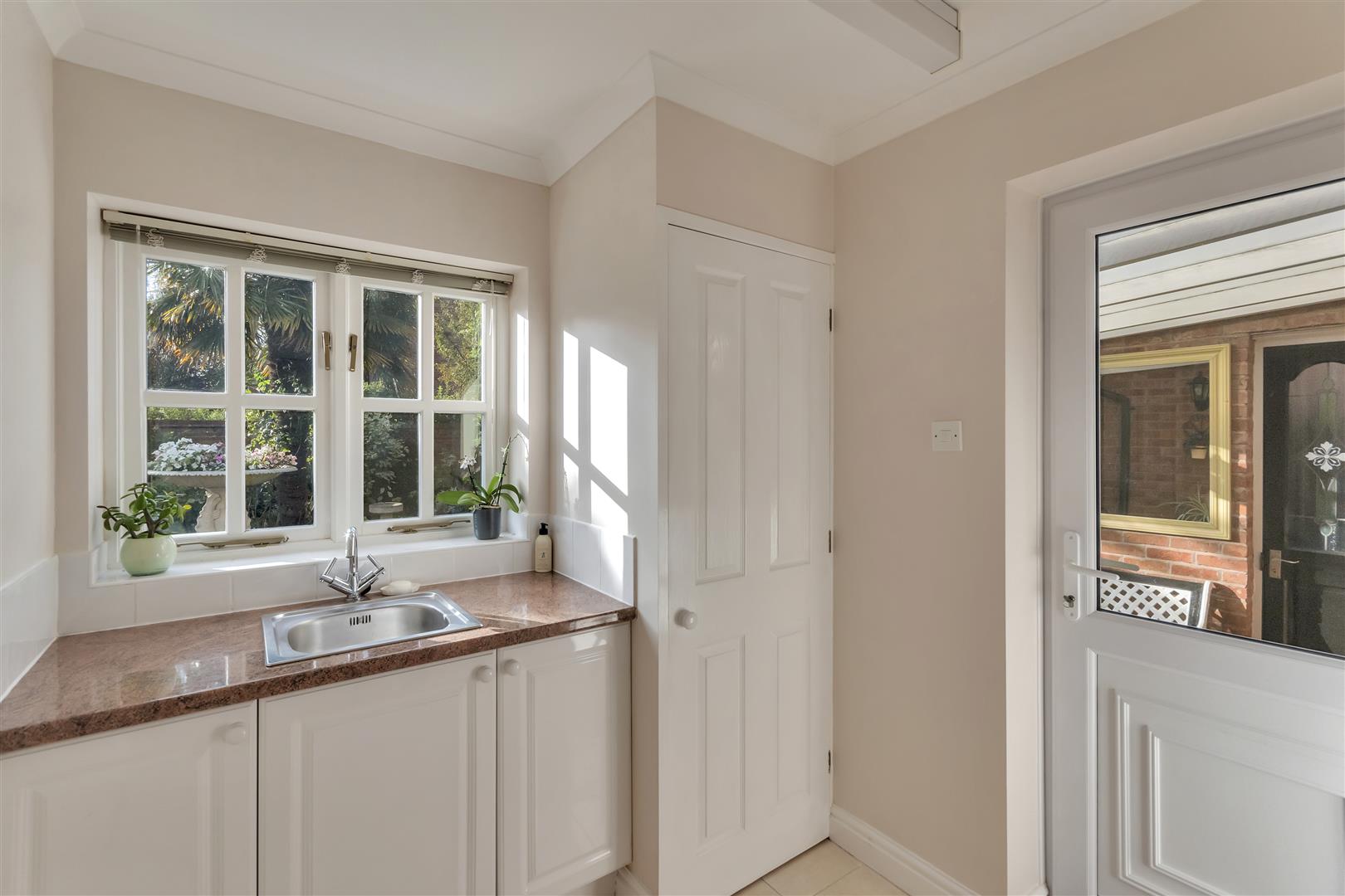 Continued tile flooring from Entrance Hallway, rear aspect wooden frame double-glazed window, base unit with laminated worktops and integral stainless-steel sink, three-quarter fridge freezer, large double cupboard containing combi boiler, single cupboard with space and plumbing for a washing machine and dryer, Glazed uPVC rear door to Covered Rear Porch, and a stainless-steel heated towel rail.