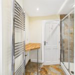 Enclosed shower cubicle, low level WC and was hand basin. Work unit with void and plumbing below for washing machine. Window to the side, heated towel rail and ceiling light.