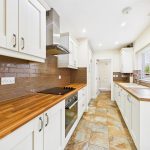 Modern fitted kitchen with a range of wall and base units with work surfaces over, inset sink with mixer tap and drainer, integral oven with four ring hob and extractor hood. Void for appliances, door and window to the side, tiled flooring and spotlighting.